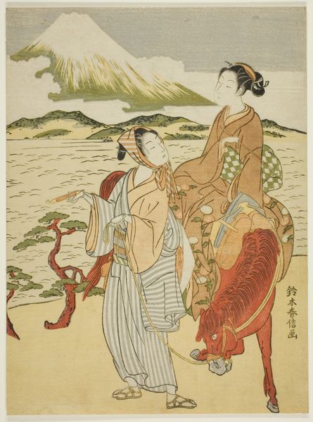 Curator: Here we have a print by Suzuki Harunobu, created around 1768. It’s titled "Fun'ya no Yasuhide, from the series Allegory of the Six Poets". Editor: My initial sense is one of melancholic beauty. There’s a delicacy to the lines and a muted colour palette that speaks to transience. It feels like a memory. Curator: Precisely. Harunobu, a master of ukiyo-e, used woodblock printing to achieve this ethereal quality. Note the subtle gradation of colour – a technique called "bokashi" – particularly visible in the sky and water. It adds depth despite the flatness inherent in the medium. Editor: And the figure…she seems to be caught in a moment of vulnerability. Her posture, the way her head is bowed, suggests contemplation, perhaps even sorrow. Or maybe she is just gathering the sleeves of her kimono as she’s stepping down. I imagine the sound of waves and wind accompanying her. Curator: Yes, she is perhaps representing the Heian-era poet Fun'ya no Yasuhide. Consider the patterning on her kimono – the repeated motifs could be symbolic, referencing themes present in Yasuhide's poetry. This print belongs to a series where Harunobu reinterprets classical figures through contemporary life. The series itself is allegorical, exploring complex themes via easily understood imagery. Editor: It’s intriguing how he blends the high and low, the classical with the contemporary. It invites us to reflect on our own connection to the past, but also to those emotions – those simple moments– that makes us who we are. And did the artists decide the text in top of the artwork as well? It seems the printmaking process includes this feature? Curator: The calligraphic text above the figure includes some poems which would enrich our comprehension and is often incorporated into the overall aesthetic composition, yes. It’s fascinating how each element works in harmony to create such a unified artistic statement. Editor: Definitely. What at first seems like a simple, elegant portrait reveals layers of meaning and artistry upon closer examination. I could stand here contemplating the subtlety in printing a while. Curator: I concur. Harunobu’s skill is manifest. His "Fun'ya no Yasuhide" is not just a visually arresting image; it’s a window into a rich cultural and artistic history.