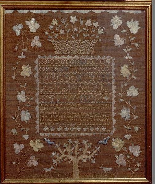 Editor: We're looking at a textile work called "Sampler" made in 1838 by Nancy Vredenburgh. It seems incredibly detailed. What strikes me is the range of images rendered through needlework; verses and animals alongside decorative borders, what can you tell me about this work? Curator: Consider the materials: linen ground, silk threads, the very act of stitching. This isn't simply "decorative art" as some might label it. This sampler represents labor, skill passed down through generations of women. Look at the text – biblical verses about youth and aging, prompting reflection. Editor: So, it’s more than just a display of skill; it is embedded in social context. Curator: Exactly. These samplers were often produced in academies or schools like the Mount Tabor Academy noted in the piece. What was being taught and what was its value for these women in that time and place? We must understand the means of production. Consider who benefits and how the sampler embodies those ideas. Is this about piety? Is this about social position? What is being consumed, literally and figuratively? Editor: So by analyzing the material, and how it’s made, we uncover these layers of social and even economic meanings tied to femininity and education at that time? Curator: Precisely. The medium, weaving and its associated process are just as important to understand as the artist or patron in determining the piece’s lasting effects. Editor: It’s shifted how I see it entirely. It's fascinating how viewing something seemingly simple, like a sampler, through a materialist lens can reveal so much about the past. Curator: It highlights the labor and production inherent in all art. Thinking materially, we understand the complex interplay between creator, object, and society.