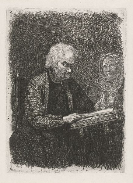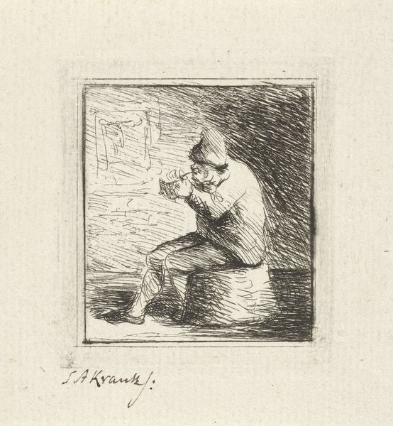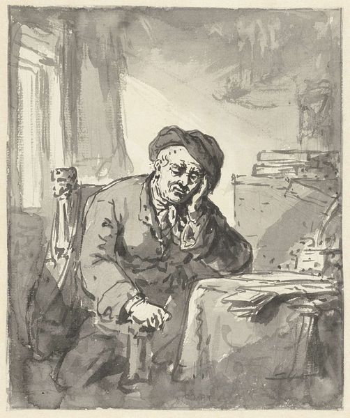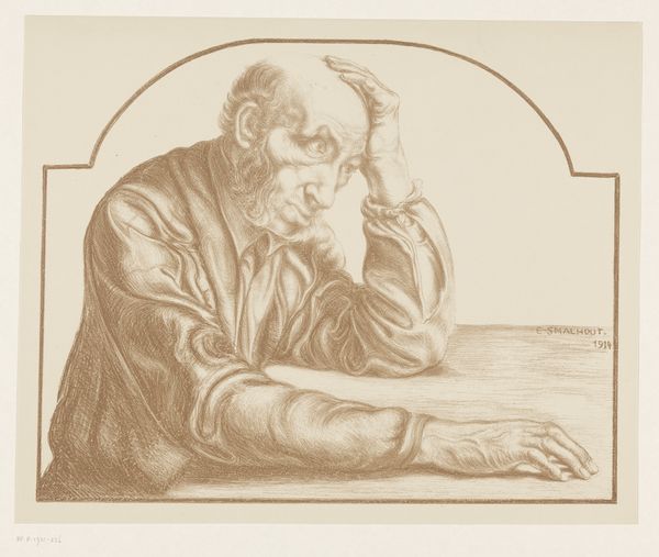Editor: Here we have Simon Moulijn's "Self-Portrait with Lithographic Stone" from 1929, rendered in graphite. It strikes me as a very internal portrait, the artist seems lost in thought. What do you see in this piece, particularly regarding its context? Curator: It's a compelling work, isn't it? Moulijn portrays himself in the midst of creation, but with an air of weariness or even struggle. This was 1929, right before the Great Depression fully impacted Europe. Could this artistic introspection reflect the broader anxieties of the era, a premonition of societal and economic upheaval? How does his positioning, head in hand, convey these themes? Editor: That's interesting. I hadn't considered the economic climate. The lithographic stone is so prominent—is that meant to signify the artist's labor and its potential instability during the Depression? Curator: Precisely! Lithography was a significant medium for artistic and commercial printing. However, the rise of new technologies always casts a shadow on established forms. What does it mean to portray oneself working with a method that might become obsolete? There’s a tension there, connecting to the era's anxieties about labor, value, and the future of work itself. Does it bring to mind any contemporary debates? Editor: Absolutely! It reminds me of discussions around AI and the gig economy today—the anxiety about artistic labour, authenticity and fair compensation. Thanks, this gave me a totally different appreciation of Moulijn's work. Curator: Indeed. Seeing the piece through this lens highlights its continued relevance. It's a portrait not just of an artist, but of a society grappling with change.