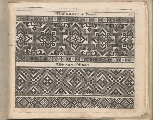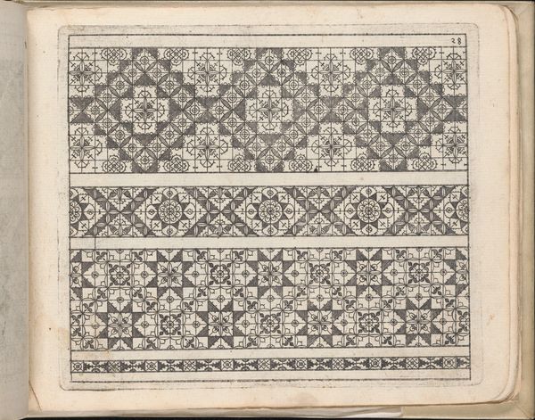 Editor: So, here we have "Vier patronen voor borduurwerk door Johann Siebmacher," or "Four Patterns for Embroidery by Johann Siebmacher," dating from around 1875 to 1900. They are graphic art prints meant as guides for textile work. They look very ordered, neat and somehow…repressed. What can you tell me about these embroidery patterns? Curator: I see these patterns as both beautiful and deeply implicated in the social structures of their time. These weren't just innocent hobbies. Embroidery, like many textile arts, was frequently relegated to women, often within a very restrictive social framework. The patterns themselves, their geometric rigidity, their prescribed nature…it all speaks to a certain expectation of women’s roles and their confinement. Do you notice how these patterns limit deviation or improvisation? Editor: That's a really interesting point. I guess I hadn't considered that the art of embroidery might not have been as free as I assumed, if these are the standard designs. Curator: Exactly! So, who benefitted from such control? Whose aesthetics are centered here, and whose are excluded? Look at the heraldic images – who would have been able to display a coat of arms in their embroidery? Thinking about the purpose of these textiles and where they’d be displayed can tell us a lot about social class. What story do you imagine the textile made with pattern LXVII tells? Editor: I hadn’t considered them as signifiers of class before, but now I see how some patterns might be much more accessible or even subversive than others. It's all about power. Curator: Precisely! It also calls into question who had access to even these embroidery designs, as they became increasingly available to the working classes. These images raise lots of questions. It moves the object from something passive into a catalyst for deeper social interrogation. Editor: Definitely. Thinking about how the accessibility of these designs intersected with social standing has completely changed how I see them! Curator: And considering the textile crafts associated with oppressed or colonized peoples gives even deeper meaning to the images!