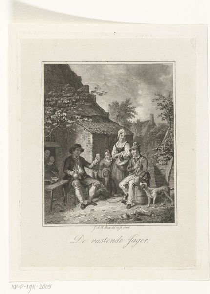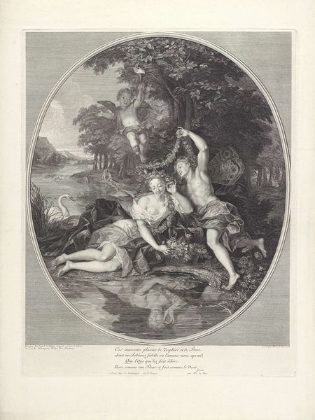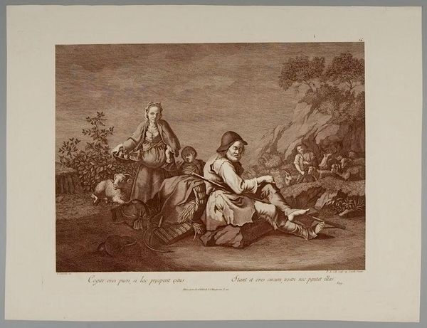 Curator: This delicate etching presents a pastoral scene, "The Rosebud and the Bird in Flight" by Alfred Alexandre Delauney. It has an airy quality. Editor: It certainly has a lighthearted feel, almost frivolous, with its focus on youthful courtship. What can you tell us about its origins? Curator: Delauney, born in 1830, was deeply engaged with reproductive printmaking. Here, we see his skill in translating Boucher's Rococo aesthetic into a more accessible format. Editor: So, this image served a specific social purpose, broadening access to a particular style and set of values. The consumption of images shapes our culture. Curator: Precisely. It highlights how artistic styles are disseminated and adapted through different materials and production methods. Editor: It makes you think about the labor involved in creating and circulating such images, and their impact on society's understanding of beauty and class. Curator: Indeed, it’s a reminder that even seemingly lighthearted art is embedded in complex systems of production and reception. Editor: A valuable insight. I'll look at this with fresh eyes.
