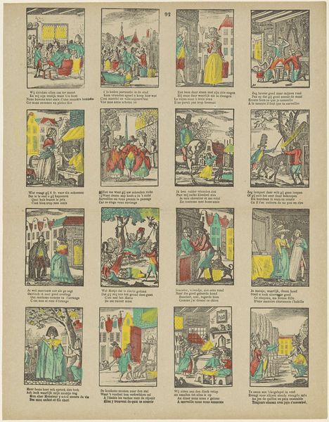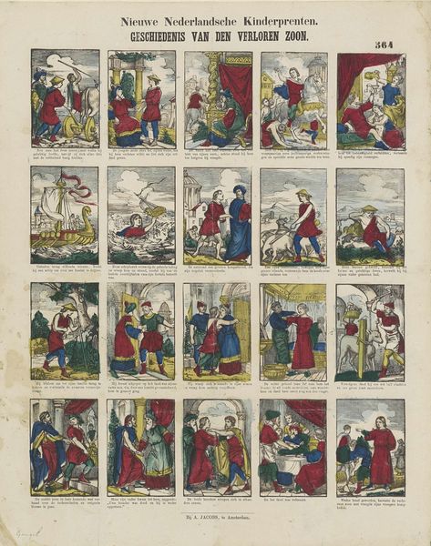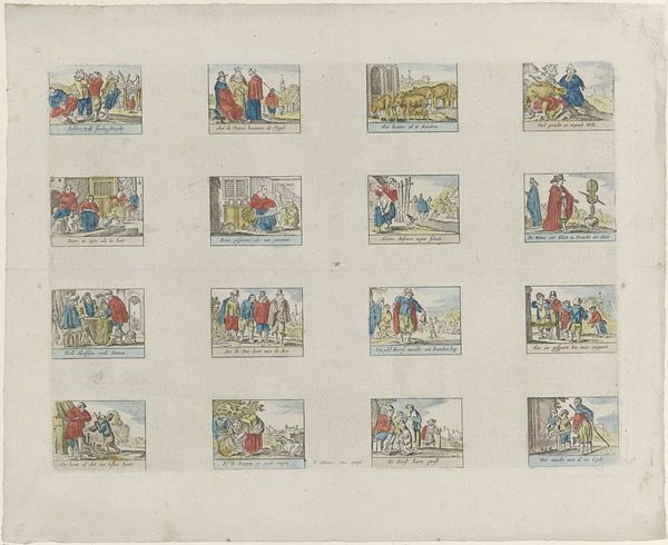 Curator: This print, created between 1856 and 1900, is attributed to Hermanus Numan. It’s titled "Volg zedekunde, en haar lessen. / Maar schiet in wulpsche harten bressen. / De mode strookt niet met haar wet; / ô jeugd! op 't onderscheid doch let" which roughly translates to “Follow ethics, and its lessons. / But shoot in lewd hearts. / Fashion does not agree with its law; / O youth! Pay attention to the difference". It uses etching and engraving techniques, and the Rijksmuseum houses this example. Editor: What a delightfully busy little thing! I immediately sense a satirical jab at societal morals… Is that right? The characters are all puffed up, ridiculous looking, like a funhouse mirror’s view of the Dutch upper crust. Curator: Absolutely. What's fascinating is to consider the print's function within the social and economic structures of its time. Prints like this would have been relatively accessible, allowing for a broader critique of societal norms, potentially even reinforcing those very norms by making them consumable as entertainment. The visual and textual elements combined make for a potent commentary. Editor: It’s interesting how sequential it is— almost like a proto-comic strip. There's this running thread of moralizing—the tension between ethics and desire… that tension made visible. Makes me think of the kind of casual judgment and irony you find scrolling social media these days. The artist probably relished crafting these little moments, I bet, finding joy in pointing out human foibles. Curator: Precisely. The repetitive nature of the panels draws attention to the industrialized aspect of printmaking and how meaning could be disseminated. Furthermore, the subtle coloring probably involved a whole workshop contributing their labor to each print. Each person had a distinct place in the making. Editor: This feels very true somehow. The combined perspectives—satire, social observation—that’s what great art boils down to, no? Finding the human in the abstract! It seems as true then, in 1880-something, as it does today. Curator: I completely concur. The way the artist leveraged mass production to broadcast ethical quandaries of youth and decorum renders this print deeply fascinating from a socioeconomic standpoint. Editor: I am taking with me today, and every day, that great art should not follow the herd and embrace our quirky nature in every manner.