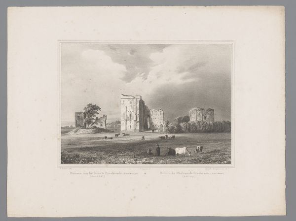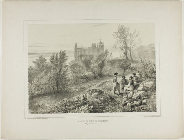 Curator: This is a lovely, contemplative work by Jean Augustin Daiwaille entitled "Gezicht op het Muiderslot," created between 1820 and 1833. The medium is ink on paper, currently held at the Rijksmuseum. Editor: My first impression is one of serenity, almost melancholy. The muted tones lend a nostalgic quality, and the castle in the background appears like a stoic guardian of a bygone era. Curator: Indeed. The Muiderslot was purchased by the state to prevent it falling to ruin, an attempt by the modernising state to invent tradition. Works such as Daiwaille's here romanticised its significance, becoming a symbol for national identity. Editor: It's fascinating how landscapes, particularly those featuring architecture, are loaded with symbolism. Castles inherently represent power, defense, and history. What's intriguing here is its softer presentation—it isn't presented as imposing or menacing, but more as a reflective monument. What can we glean of national identity here? Curator: That gentler image perhaps signals a shift away from warfare and aristocratic control in the Netherlands, and the gradual forging of bourgeois virtues. What might have previously stood as a display of military might, becomes softened by being picturesque. This is an image of property secured through careful management, perhaps. Editor: Look at the water. It gives a great impression of movement and continuity. The boaters perhaps denote transit, journey and even destiny? Also consider the fishermen; they would be seen as people with humble but essential professions. Are we witnessing the artist making statements about hard labour? Curator: Labor, trade, reflection on the national project… yes, there’s so much layered within what might appear to be just a simple, attractive landscape. These visual devices are very subtle. Editor: Absolutely, a compelling instance of how landscape art conveys profound cultural and societal messages. Curator: I’ll certainly be thinking about Dutch identity in a new light thanks to Daiwaille and this drawing.