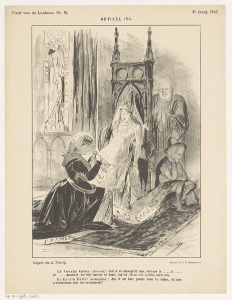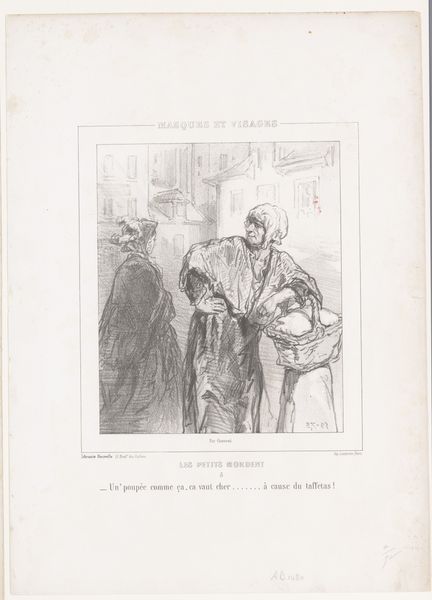 Curator: Today we're looking at "The husband wants him to look at his hot-bed, the friend only dreams of seeing his wife, plate 3 from Les Amis," a lithograph by Honoré Daumier from 1845. Editor: What strikes me immediately is the humor, but tinged with something darker. The awkwardness, the yearning...it's all there in the lines, isn't it? Like a little comedy playing out on the page. Curator: Precisely. Daumier masterfully employs caricature to critique social mores. Note the contrasting postures: the husband, stiff and expectant, gesturing grandly, versus the friend, slouching with what appears to be longing, almost melancholic, for his wife, whose figure stands above them on a balcony. Editor: He looks defeated almost! That droop! The shading certainly guides the eye to that sentiment; you can feel that weight in the lithography, so grey against grey, but if the husband knew his friend could see his wife at the window above, that he would much rather visit his gaze to her, what does it mean! It reads of isolation. Curator: The artist directs the viewer to consider the spatial relationships, yes. The window functions as a subtle barrier but also a beacon, emphasizing the chasm between public duty and private desire. Observe how the graphic weight of the figures in the foreground throws this element into high relief. Editor: It's the body language, right? They practically speak without words. One yearning for some vision of a dream-wife while they stand beside the... bed? That is an active choice! Curator: Undoubtedly, Daumier harnesses this moment to construct a subtle but incisive commentary on love and friendship in a society tethered to obligation. His masterful use of line creates both visual tension and narrative depth. Editor: In its very making, Daumier highlights a common ailment in romance that even in present day audiences can reflect upon and be mindful about; to know someone is beside you who still has desire, what are they seeing; maybe a future; or what it once was, maybe it is lost, the possibilities spin right off the page like I am dreaming in lithograph too. Curator: A perceptive observation, I agree! Ultimately, this lithograph leaves us contemplating the intricate dynamics of human relationships and our perpetual search for affection. Editor: It reminds us that laughter, like art, can sometimes reveal a sadness deeper than the joke itself. It is lovely, in a pitiful way, which, in truth, speaks volumes about our collective human condition!