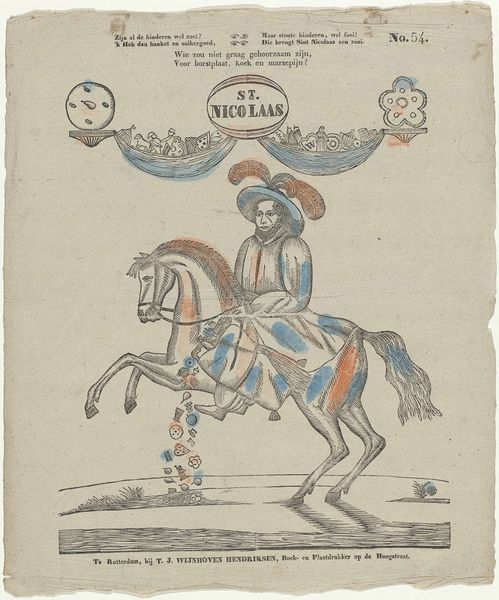 Curator: This drawing, known as "Het hobbelpaard," which translates to "The Rocking Horse," comes from the period between 1833 and 1856, attributed to Glenisson & Van Genechten. It employs a range of media including ink, watercolor, and print on paper. Editor: The first thing that strikes me is the constrained feeling. The colors, while present, seem hesitant, as if applied after the initial drawing with some uncertainty. Curator: I think that hesitancy speaks volumes about childhood in this era. Note how the rider, in elaborate, almost theatrical clothing, embodies both power and play. The rocking horse itself becomes a vehicle for not just amusement, but also perhaps, early lessons in social rank and presentation. Editor: Absolutely, and let's not forget the tradition of equestrian portraiture of nobles. This echoes back to classical sculpture but now tamed to a child’s size. The whole artwork feels like a cultural exercise – carefully controlling youthful spirit into socially accepted molds, so it reveals the politics behind childhood and display during that era. Curator: Precisely. Look at how the toy echoes the design and purpose of actual steeds, signifying continuity between the innocent game and later participation in the dominant order. The child isn't just playing, but also learning a system of status. Editor: This links to cultural memory, doesn’t it? Toys that educate subconsciously by incorporating signs, traditions and symbols reflecting a desired social structure and order. In this instance, power is translated into form and imbued on a childhood game. Curator: Exactly. While seemingly simple, “The Rocking Horse” acts as a complex time capsule – layering childhood, social education, and an entire world of hierarchical values. Editor: Thinking about it that way offers a new insight. I initially read it as constrained, but seeing these symbolical connections actually demonstrates how it represents social and cultural conditioning in art. Curator: Indeed. It’s in understanding this intricate symbolic code, we begin to unpack the artwork's lasting meaning and effect.