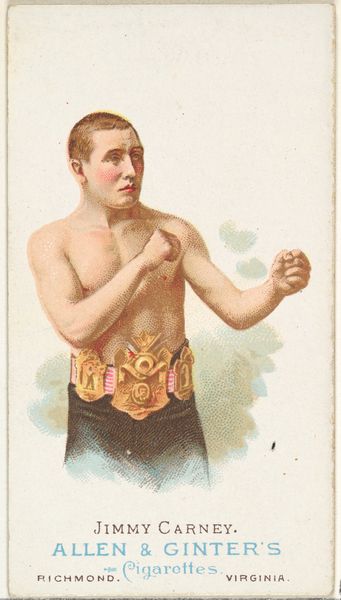 Editor: We’re looking at "Charlie Mitchell, Pugilist" a print from 1887 by Allen & Ginter Cigarettes, housed here at the Met. It feels like a straightforward, almost classical depiction of athletic prowess, but something about its simplicity feels very modern to me. What catches your eye about this piece? Curator: The immediate observation concerns the geometric purity within this composition. The subject, rendered with smooth tonal gradations indicative of collotype and lithographic processes, is rigidly centered. The composition is elegantly divided: The upper two-thirds occupied by the figure, the lower third devoted to textual elements. Note how the red sash cinches the figure, functioning not just as costume, but as a visual anchor, heightening the figure's balanced symmetry. Editor: So you are suggesting the sash has both functional and visual importance, creating unity? Curator: Precisely. Consider, too, how the negative space serves to isolate the figure, directing our gaze solely towards its form. The colour palette, dominated by muted tones and highlights that play across Mitchell’s musculature, emphasizes the structural integrity of the athletic physique. Editor: I never considered negative space a structural element; interesting how form and void can be equally meaningful. Does the text contribute to your structural interpretation? Curator: Undeniably. The textual inscription grounds the image within its original context – a collectible card. It transforms the pugilist into a commodity, subtly influencing our interpretation of the depicted strength and discipline. The interplay between image and text introduces a dialogue regarding representation and commercial enterprise. Editor: It’s like a visual equation: figure plus brand. Thank you, seeing that tight relationship really brought the piece alive for me! Curator: A pleasure.