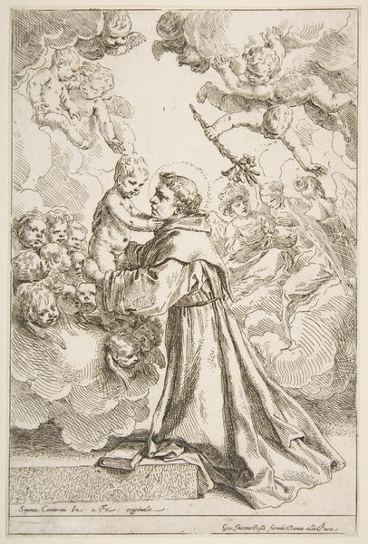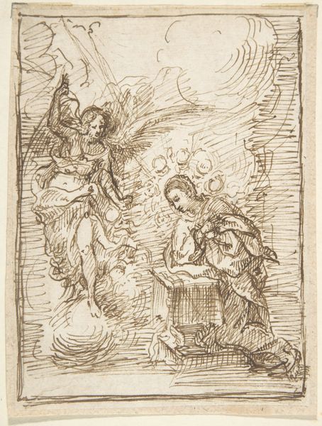 Curator: What strikes me immediately about this work is the stark contrast in textures - the delicate rendering of the angel and cherubs against the more heavily worked figure of Saint Dominic. Editor: Good eye. This is "Angel Appearing to Saint Dominic," attributed to Giacinto Calandrucci, its date of creation remains undetermined. Executed in chalk on paper, the drawing embodies Baroque dynamism. Look at how Dominic kneels, hands raised to a descending angel, seemingly caught in a moment of divine communication. It speaks to the intersection of earthly devotion and heavenly intervention within the Catholic Church. Curator: Absolutely. The composition is so compelling when viewed from a materialist perspective. We see Calandrucci’s mastery of chalk to convey different levels of being, from the rougher, tangible texture of the Saint's habit to the ethereal quality of the angel and the almost dreamlike suggestion of other celestial beings looking on. What did chalk as a readily available and less expensive material offer the artist in creating this image? Editor: A significant point. The choice of chalk may have facilitated both rapid execution and widespread reproduction of religious imagery. Note the skull on the left—it infuses an element of mortality into the sacred narrative. Considering this visual element, this depiction perhaps intends to negotiate the anxieties around death that defined that society at the time. What position did one have to hold to be a religious leader and, in turn, meet an angel? Was this a shared sentiment to want closeness with an omnipotent power? Curator: And think about the labour involved in extracting and processing chalk during this era, not just for artistic endeavors, but also for writing, building, and medicine. Its everyday applications emphasize how ubiquitous this mineral was, even within sacred contexts like this. The production and distribution networks for this relatively common material allowed this specific imagery to reach more eyes and hopefully spur widespread belief and recognition. Editor: That material access directly influences cultural impact, and ultimately it shapes perceptions of power, belief, and identity. Thinking through this from different angles certainly deepens my experience with the work. Curator: Mine as well. Reflecting on both process and context allows us a more holistic appreciation of Calandrucci's piece.