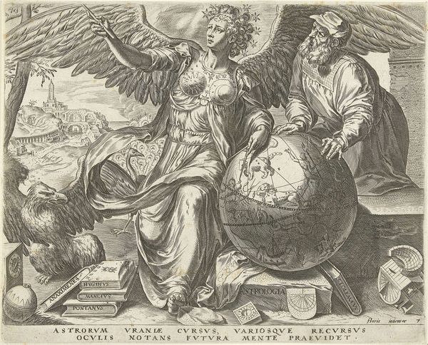 Curator: This is Cornelis Schut's "Astrologia," a fascinating intaglio print. Editor: The etching feels…aspirational. Everyone is gazing upwards! The man, the winged figure...even the putti want to reach those clouds. Curator: Schut, who lived from 1597 to 1655, clearly understood the market for allegorical prints. Here, we see the personification of Astrology instructing humanity. Editor: Note the celestial globe—a tool, but also a symbol of knowledge and power. Curator: The engraving process allowed for detailed lines, crucial for rendering the complex patterns and textures within the allegorical figures' drapery. Editor: It’s a dense composition, yet the upward movement gives it a lightness. Almost makes you forget it’s just ink on paper. Curator: Absolutely. The use of light and shadow, achieved through varied line thickness, adds depth and drama. Editor: You know, I'm drawn to the way the figures interact—it's not just didactic, it's almost tender. Curator: The print encapsulates a period deeply invested in both scientific inquiry and symbolic representation. Editor: It really does. It’s a glimpse into how the world was understood—or perhaps, how it was hoped to be understood.