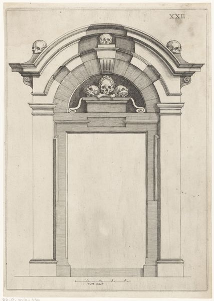 Editor: Here we have an engraving from 1631 titled "Poort tot begraafplaats bij de Westerkerk," or "Gateway to the cemetery at the Westerkerk." It’s anonymous, rendered in ink on paper, and depicts just that, a cemetery gateway. I find its starkness very compelling, almost unsettling with the prominent skulls. What do you see in this piece? Curator: I see the conspicuous materiality of death serving as a stark reminder of the limitations and transience of human existence during a time of great social and economic upheaval. Consider the means of production here – an engraving, a print. This implies reproduction, circulation. Were these images made for public consumption, reminders of mortality amid daily life and mercantile activity? Editor: So, it's less about artistic expression and more about its societal role through reproduction? Curator: Exactly. Ask yourself about the purpose behind its creation. What message were they trying to convey? The skulls and skeletons point to Vanitas traditions of the time. Note also that this isn't merely a representation; it's architectural. Why present death within a seemingly stable framework, a gateway of sorts? What controlled resources would be required to erect a permanent physical copy of this design, and for whom? Editor: That’s interesting – framing it within the economic context. The gate suggests access, but to what, and for whom? Is the “gateway” aspect more of a societal statement? Curator: Precisely! It underscores the way death becomes a kind of cultural currency, almost commodified within society. Death is unavoidable and also impacts the means of production for life as we know it, doesn't it? The very material presence of these images serves as a form of social commentary, speaking to the ephemerality of life. Editor: I hadn't considered it that way, focusing instead on its symbolism. I see how exploring its purpose changes my view of the work. Curator: Looking at the production of art in terms of its utility, and place within labor practices changes everything. The way we consume images too… we’re participating in the tradition even now!