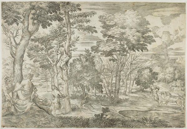Editor: Right now, we’re looking at “Landscape with Nymphs and Satyrs” by Giovanni Francesco Grimaldi, made somewhere between 1616 and 1680. It’s an ink drawing, an engraving actually, and has a dreamy, almost fantastical feel to it. What strikes you most about this piece? Curator: You know, when I look at Grimaldi’s world here, it whispers stories of ancient woods, doesn’t it? The way the nymphs lounge, almost melting into the landscape, feels like a secret we’ve stumbled upon. And those satyrs? Mischief dances in their steps! It makes me wonder what tales those trees have witnessed… Does the composition make you feel like a voyeur, or are you welcomed into their world? Editor: I definitely feel like I'm intruding a little, but in a good way! I guess I'm caught up in the details of the line work; everything is so finely etched. Curator: Yes! The lines! Like whispers mapping out the soul of the woods. It’s a technique typical of baroque landscape. This precision breathes life into a myth, grounding it just enough that we *almost* believe we could stumble upon such a scene ourselves. Don’t you feel you could almost step into that grove? What secrets would *you* seek amongst the nymphs? Editor: I think I would be too scared to actually enter the forest... So, I guess I admire that the drawing allows my imagination to run free but keeps a certain distance. Curator: Exactly! That's the push-pull that keeps it so intriguing. It's not just *a* landscape, it’s a landscape of the *mind*. Perhaps all landscapes are, in some way. Editor: So it's less about accurately representing nature and more about exploring a feeling or an idea through nature? Curator: Precisely. Grimaldi wasn't just sketching trees and mythical creatures; he was painting with light and shadow to evoke the primal sense of freedom and untamed wildness that lived inside him, perhaps, hoping to spark something equally feral in *us*. Editor: Wow, I didn't consider it that way. Thanks for illuminating that for me! Curator: And thank *you* for the refreshing viewpoint! This ink now speaks a richer story, somehow.