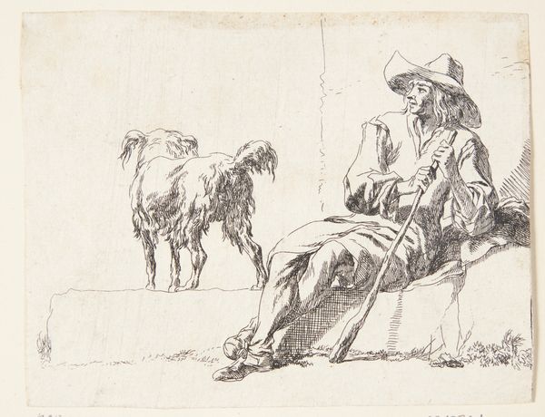 Curator: Here we have a drawing entitled "Zwei Knaben mit einem Ziegenbock," or "Two Boys with a Goat," attributed to Karel Dujardin. Though undated, Dujardin was a Dutch Golden Age painter active during the Baroque period, celebrated for his idyllic pastoral scenes. Editor: It’s quite striking! My first impression is one of slight melancholy. The reddish-brown ink gives it a warm feeling, yet the young boys appear burdened by the weight, both literally and perhaps metaphorically, of the animal they’re carrying. Curator: You know, such scenes, showing children involved in everyday rural labor, became quite popular. They represented a particular vision of humble life, appreciated by an increasingly urbanized viewership in the Netherlands, but were also intended to communicate a more moral message about industry and simplicity. Editor: Industry certainly comes to mind. The younger boy straining under the goat's weight feels rather poignant when considering child labor in broader historical contexts. I can't help but see this artwork through a more critical lens – as a depiction which naturalizes such activities within a seemingly idyllic landscape. Curator: That's a good point. We must be careful about romanticizing the past. There is very little romantic about working hard. Of course, Dujardin was celebrated for precisely that ability—his facility for integrating figures and landscapes, drawing on Italian influence from his travels, to produce scenes considered visually pleasing. Note also the spontaneity in the mark-making. This appears a quick study rather than a highly finished piece. Editor: I appreciate the emphasis on its seeming artlessness! It reminds me how visual registers associated with the bucolic still saturate our present. And whether its function is aesthetic pleasure or an endorsement of values related to innocence, art such as this invariably carries ideological weight. Curator: Agreed. Ultimately, it invites us to consider how the portrayal of childhood innocence intertwines with historical realities. Editor: And it reminds us that looking, really looking at art, requires us to connect visual pleasure to more challenging questions.