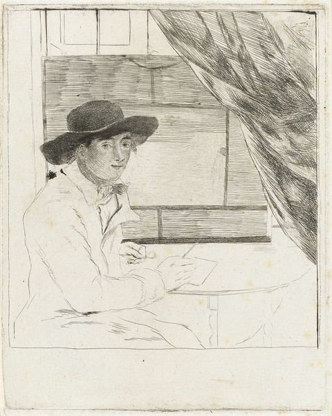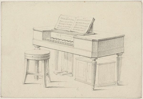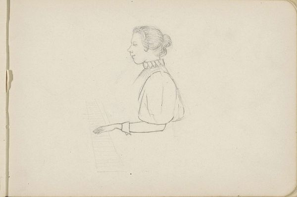 Curator: Alright, let's turn our attention to "A Pianist Seated at the Keyboard," a drawing rendered in ink and pencil, crafted in 1795 by Johann Friedrich August Tischbein. What springs to mind? Editor: There’s something immediately intimate about this sketch. It’s as though we've caught the pianist in a private moment of creation. It feels... unfinished, raw, almost vulnerable. Curator: Exactly. Observe how Tischbein uses a dynamic network of lines to capture both form and shadow. The hatching technique suggests volume without the need for meticulous detail. Consider how this lends an air of immediacy to the composition. Editor: I love the open window to the left, papers haphazardly tossed on the ledge – such a clever inclusion that really transports us inside the scene. I'm imagining light filtering in as he plays. Do you think he captured this in his own house? Curator: Likely! It embodies certain characteristics of Romanticism: the emphasis on emotion and individuality but in a particularly domestic setting. The genre-painting aspect situates art in the sphere of everyday life. And note his technique... the subtle gradations achieved with simple materials are very typical of his preparatory sketches. Editor: He almost appears startled that we are watching him. Curator: You pick up on an intriguing point. His gaze holds our attention; this fleeting, candid instant suggests much more than merely a man playing. His world seems very accessible but is ultimately unknown. Editor: Absolutely. This seemingly simple sketch reverberates with unspoken thoughts and passions. Curator: Precisely. I keep discovering something new each time. Editor: As do I... an everyday symphony!