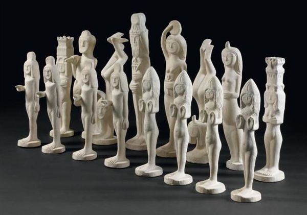 These are the 'Chessmen (32),' crafted from ceramic by David Dunderdale & Co. in the 19th century. The chess pieces, uniformly white, present a study in miniature figuration. Notice how each piece is meticulously molded, and the surface texture varies from smooth to subtly rough. The overall monochromatic palette focuses attention on the forms themselves, allowing the intricate details to emerge. The chessboard is a theater of war, where the conflict of black and white, light and dark, are intrinsic to our reading of the game. The ceramic medium adds a layer of meaning, its fragility contrasting with the strategic aggression inherent in chess. Each piece has a distinct silhouette, immediately recognizable and representative of its role on the board. This set exemplifies how form dictates function and, by extension, meaning. The set invites us to consider not only the game's strategic elements but also the cultural and historical context in which such objects are created and appreciated.