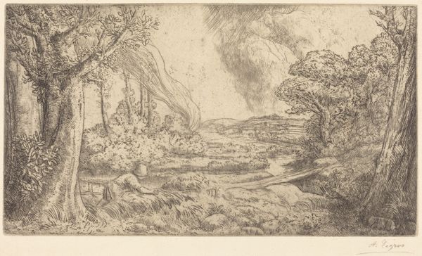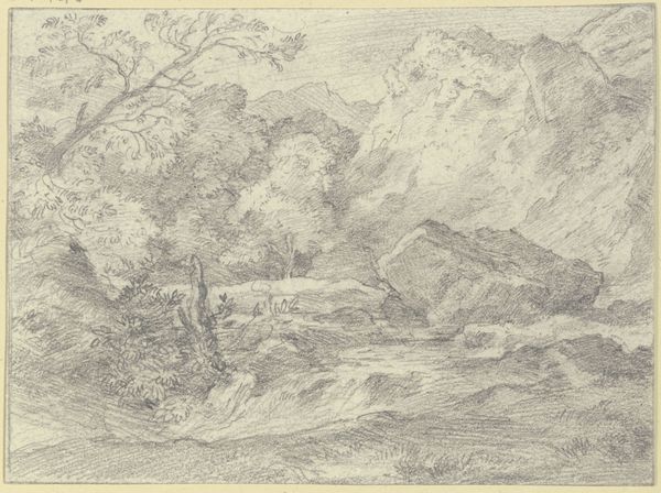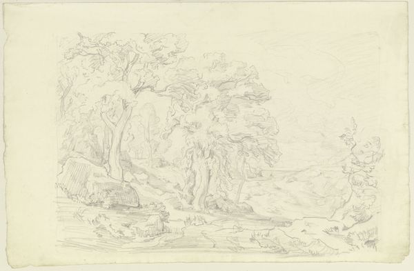 Ferdinand Olivier created this landscape drawing, "Landschaft mit Bäumen und Felsen," at an unknown date using graphite. Its subdued tones and intricate linework invite us into a realm of quiet contemplation. The composition, framed by a subtle geometric border, depicts a harmonious arrangement of natural forms. Note how Olivier uses line to define the rough texture of the rocks and the delicate foliage of the trees. This suggests an interest in the sublime, where nature overwhelms with its grandeur. The structure of the image invites a semiotic reading where rocks and trees function as signs within a broader cultural discourse, hinting at Romanticism's reverence for nature as a space of spiritual solace. Notice the detailed execution of the drawing which doesn't just depict a scene, but evokes an emotional and intellectual engagement with the natural world. This interplay challenges us to view art not just as representation but as a deep, ongoing dialogue between the artist, nature, and the viewer.