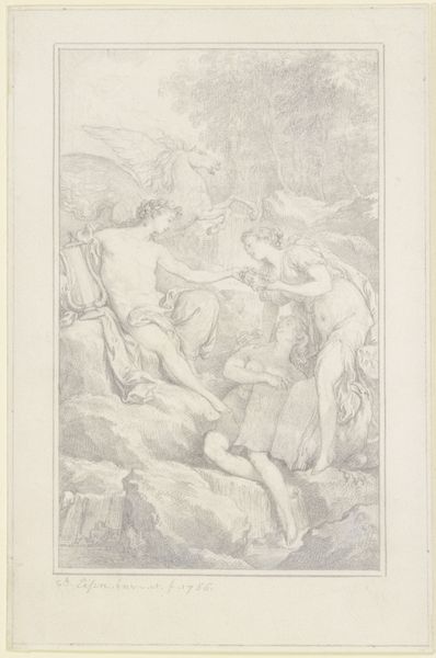 Curator: Looking at Giuseppe Diamantini's "Flora and Mercury," created sometime between 1690 and 1700, one immediately notices the flurry of activity. Editor: Indeed, my initial feeling is one of lightness, even ethereality. The figures seem to float, almost dissolving into the clouds. Curator: Let's consider Diamantini's process. As an engraving, each line required careful labor, a dance between the artisan and the copper plate. It speaks to the Baroque fascination with complex figuration. Editor: Absolutely, the dynamic composition creates movement, heightened by the delicate, almost fragile, linework. It's all about line and form describing figures, a semiotic field ready to be interpreted. How would you decode Diamantini's formal arrangement of Flora and Mercury here? Curator: This interplay, as you point out, leads to further probing. Were these images produced for elite consumption, reinforcing classical ideals of beauty? Was the workshop reliant on unskilled labor for preliminary stages? These details add context. Editor: Context is helpful, certainly. But let’s stay a bit longer with form: consider how the serpentine curves of the figures mirror each other, enhancing the piece's overall sense of flow, guiding our eye in very controlled pathways around the composition. It gives it unity despite all the activity. Curator: Fascinating that a reproductive method – engraving – can display such a dynamic interpretation while referencing the consumption ideals of the era. It allows art to exist in multiple places, shifting power and how value gets applied to visual artistry. Editor: I see how a Materialist might interpret that democratization through production, which I concede is interesting. However, I believe its sustained visual appeal originates in its composition. Regardless of origin, viewers continue to connect emotionally with the composition, which is pretty remarkable. Curator: Truly. And how this object reflects material labor gives more context to its success. Editor: A fitting convergence of insights to bring us to a close here.
