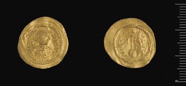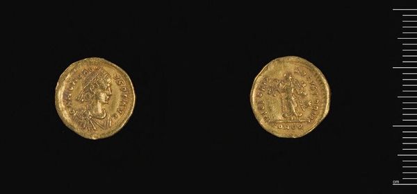 Editor: Here we have a gold coin of Justinian I. Considering how small it is, it seems to carry a lot of weight. What do you see in this piece? Curator: More than currency, it's a potent symbol of power and identity. The Emperor's image, deliberately circulated, projected authority throughout the Byzantine world. How did this object shape perceptions of leadership, gender, and even divinity? Editor: So it’s like propaganda in my pocket? Curator: Precisely. Consider how this single coin participated in broader narratives of imperial dominance and societal control. What impact did this have on the masses? Editor: That’s a lot to think about for something so small. It's fascinating how material objects can embody such complex histories.
