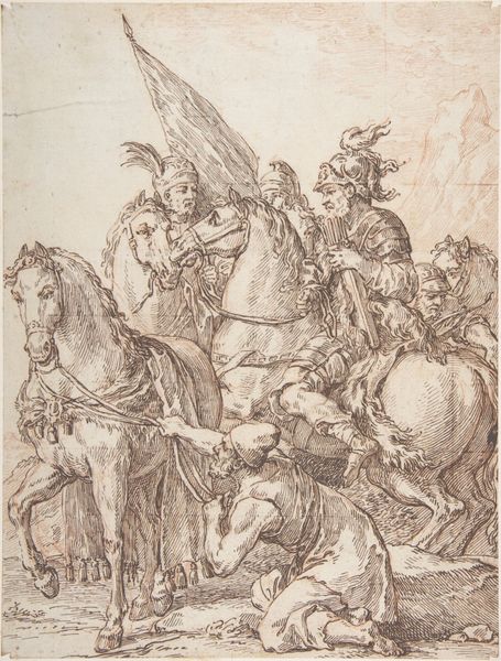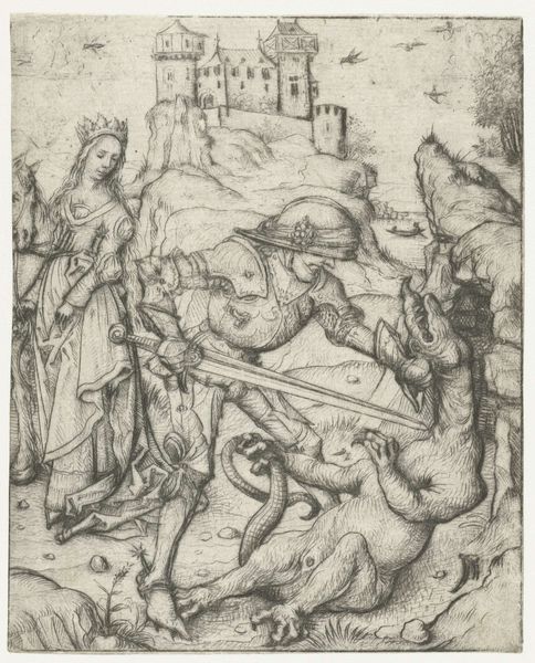 Editor: So, this is "Trots," an engraving by Heinrich Aldegrever from around 1550, currently held at the Rijksmuseum. What immediately strikes me is the density of the line work. It seems incredibly detailed for an engraving. How might you approach this piece? Curator: I'm drawn to consider the engraving as an object produced under specific conditions. We need to look at the labor involved, the availability of materials like copper plates and engraving tools, and the networks through which Aldegrever circulated his prints. This wasn't just about artistic inspiration; it was about production and consumption in 16th century Europe. Editor: That's a great point. I tend to focus more on iconography. Here, we have a woman on horseback trampling a lion. Curator: Right, but the "why" of that image comes from understanding the social context. Who was buying these prints? What messages were they meant to convey and reinforce for their intended audience? Allegory was a product to be consumed. Also, the means of replicating it in multiples had social and political consequences. Consider that the production process was also how the artistry became accessible to many different people at once. Editor: I never really thought about it in terms of accessibility, the print *is* more democratic. Are the materials themselves reflective of that push? Curator: The relatively inexpensive materials—copper, paper, ink—allowed for wider distribution. Also consider how the print medium elevated the status of draftsmanship, making technical skill a valued commodity. Editor: So, the value isn't just in the artistic concept but also in the labor and materials... Curator: Exactly! Looking at art this way encourages us to rethink traditional hierarchies that elevate painting above printmaking or 'high art' above 'craft'. Editor: This perspective makes me consider the role of the artisan so differently. I think it's essential to remember that art is produced, consumed, and deeply linked to social and material conditions. Thanks, this was illuminating. Curator: Indeed. I see how focusing on materials shifts our emphasis to understanding art as both an ideological product and a practical artifact of labor.