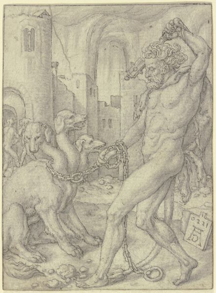 Editor: This engraving, "Saturn Holding an Infant and a Scythe," was created in 1533 by Heinrich Aldegrever. It’s a rather unsettling image – the figure of Saturn looming large and menacing. What do you see in this piece? Curator: Aldegrever’s work reflects the complex social anxieties of the 16th century. Consider how Saturn, often associated with melancholy and destruction, is depicted. He stands in stark contrast to the image of a defenseless infant. What impact do you think the printing press, still a relatively new technology at the time, had on how people perceived these traditional astrological symbols and their associated anxieties? Editor: That’s a great question. I guess wider circulation would mean more people were exposed to and influenced by such imagery. Do the details – like the townscape in the background or the animals – have symbolic weight? Curator: Absolutely. These elements speak to the perceived influence of Saturn on worldly affairs. The crumbling ruins can be seen to represent decay and the ephemeral nature of earthly power. Aldegrever positions Saturn as not merely a mythological figure, but an active force in human society. Editor: So, this wasn’t just a depiction of mythology; it was a commentary on society at the time. A pretty bleak one! Curator: Exactly! It prompts us to think about the public role of art in reflecting and shaping societal anxieties, about power, death, and the perceived futility of earthly endeavors, anxieties heightened perhaps, by the religious and social upheavals of the Reformation. How the artist, through distributing printed imagery, inserts himself in these polemics is itself a potent act. Editor: This engraving feels so much more complex now. It's not just a representation of Saturn, but a reflection of a world in flux. Thanks for shining a light on the socio-historical background of this image. Curator: Indeed. Analyzing art through its historical context allows us to understand how it reflects, shapes, and is shaped by society. It certainly is a bleak, but intriguing artwork.