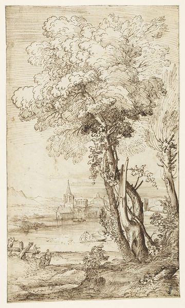Editor: This delicate pen and brown ink drawing is titled "An Italian Landscape" by Cornelis Cort. What strikes me is the imposing tree, almost like a sentinel overlooking the scene. What do you see in this piece? Curator: Indeed. Trees often symbolize connection—roots to the earth, branches to the heavens. Consider the strategic placement of this tree, anchoring a composition filled with classical ruins and distant hills. Does it suggest the enduring presence of nature amidst the remnants of human ambition? Editor: That’s a fascinating point. It almost feels like nature reclaiming the landscape. Curator: Precisely. Observe the birds soaring in the sky, a symbol of freedom, perhaps commenting on the fleeting nature of earthly power. Editor: I hadn't considered that. It definitely shifts my perspective. Curator: Symbols offer a layered reading of art. The landscape transforms into a meditation on time, memory, and the cyclical patterns of existence. Editor: I'll remember that when I look at other landscapes. Thanks!