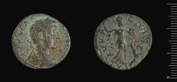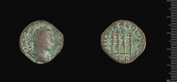 Curator: This is a coin of Eusebeia-Caesarea, minted under Gordian III. Editor: Even worn, it evokes a sense of antiquity. I see both the portrait of Gordian and what appears to be an image of a temple. Curator: Indeed. Its material tells us much about Roman administration, trade, and even artistic production techniques. Editor: The temple immediately suggests ritual, devotion, and the emperor's connection to the divine. Even the word "Eusebeia" hints at piety. Curator: I'm most struck by how ubiquitous these coins were; a clear example of the integration of labor and politics. It's almost banal. Editor: Yet, the imagery held tremendous power. Its symbols were a constant reminder of the emperor's authority and Rome’s values. Curator: So, something as simple as a coin can reveal so much about cultural memory and material life. Editor: Absolutely, a small object that speaks volumes.
