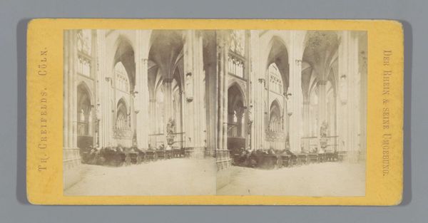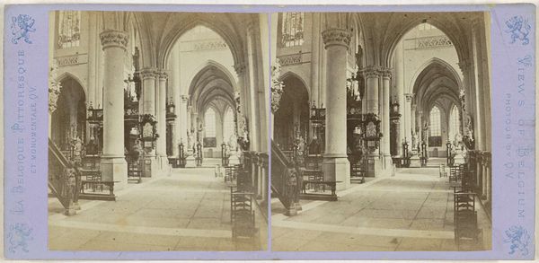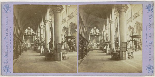 Jules Hippolyte Quéval captured this image of the Sint-Pauluskerk in Antwerp using stereoscopic photography. The photograph's composition draws our eye into the depths of the church. It is a play of light and shadow across the architectural forms. Note how Quéval's strategic use of linear perspective creates a sense of endless space. The arches and columns rhythmically recede, guiding our gaze towards the vanishing point. The stereoscopic effect enhances this depth, almost inviting us to step into the scene. Yet, this illusion of depth is challenged by the photograph's surface. The texture of the photographic print reminds us of its material reality as an object, disrupting any seamless immersion into the depicted space. The photograph thus exists in a liminal space between representation and abstraction. It is a negotiation between the objective capture of reality and the subjective experience of space. This tension reflects broader philosophical questions about perception and representation that continue to resonate today.