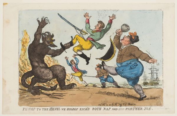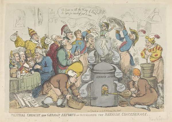 Editor: This is "Beroking van de Corsicaan, 1813," or "Fumigating the Corsican," by Thomas Rowlandson, created with etching and ink. It's certainly a busy composition. The figures are so exaggerated. It almost feels like political propaganda. How do you interpret this work? Curator: Indeed. The exaggerated figures and satirical title are key to understanding its socio-political context. Rowlandson was a master of British caricature, and this piece reflects the widespread animosity towards Napoleon Bonaparte, or "the Corsican," in England during the Napoleonic Wars. Notice how Napoleon is choked by the smoke of his enemies’ pipes. Editor: Yes, I see that now. It seems like a roasting! Curator: Precisely! Think of it as a visual representation of public opinion. It's interesting to analyze how the artist uses this “smoking out” metaphor to express political anxieties. Also note the centrality of "Real Hollands Geneva;" drink was an important social lubricant for political discussions. Consider also the figure perched atop the barrel drinking porter. Editor: It does highlight the social atmosphere, that political opinions were shaped, perhaps even fueled, in places like pubs and taverns. This print becomes a record of a specific historical perspective. Curator: Exactly. These prints were often widely circulated, shaping public perceptions and contributing to the national narrative of the time. Think about the power of such imagery and its role in reinforcing specific viewpoints. Do you think it accurately reflects the sentiment of the time? Editor: Probably; maybe it even magnified that sentiment. I hadn't considered how the production and circulation of prints like these contributed to a specific public role of art during this era. Curator: And that’s the crucial thing to consider - the power of art not just as representation but as an active agent. Editor: Thanks, it makes me see it as more than just a funny picture. It reveals some deeper implications about popular politics.