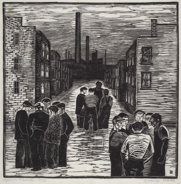 Lucienne Bloch created "Strike in the Ruhr" in 1929, using woodcut on paper to capture a scene charged with tension. The artwork's stark contrast between light and shadow carves out a narrative space, where industrial architecture looms over huddled figures. Bloch's composition divides the scene into distinct planes, foregrounding groups of workers amidst the oppressive backdrop of factories, their towering chimneys piercing the sky. The use of light and shadow accentuates the figures' forms, particularly the striped clothing, possibly emphasizing the uniform identity of the working class. This pattern creates a rhythm that leads the eye deeper into the industrial setting, evoking a sense of confinement. The woodcut technique itself, with its bold lines, reinforces the image's thematic concerns. These visual elements are not just aesthetic choices but also function as signs within a broader socio-political discourse. The artist creates a space that challenges the viewer to consider the artwork's complex interplay between form and content. This visual language allows for a continuous re-evaluation of its meaning.
