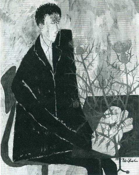 This portrait was made by Vsevolod Maksymovych using ink on paper. The artist has used the stark contrast between black and white ink to create a visually striking image. Look closely, and you'll see how the application of ink defines the entire composition. The figure emerges through careful strokes, forming the dark suit and the patterned trousers. The artist uses contouring to define the planes of the face, and the eyes are made with small, deliberate dots. The background is created from various-sized circles, made using careful mark making to create an almost dizzying effect. The artist's chosen materials and techniques speak to a wider social context of artistic experimentation. The use of ink allowed the artist to explore the limits of graphic representation, while also engaging with the broader aesthetics of the early 20th century. Ultimately, the artist pushes the boundaries between fine art drawing and graphic illustration.
