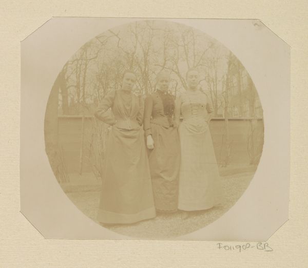 Editor: This gelatin silver print by Willem Frederik Piek Sr., entitled "Johanna Margaretha Piek, Carel Overhoff en een onbekend persoon in een grasveld, mogelijk nabij Arnhem," was taken sometime between 1889 and 1893. I’m struck by the gentle tonal gradations and the rather still, quiet atmosphere. What visual elements particularly stand out to you? Curator: Immediately, it's the careful composition, and specifically how the artist guides the viewer's eye through a play of light and shadow. Notice how the slightly out-of-focus figures create depth, while the horizon line remains rather vague and undefined. This draws us into an evaluation of textures. Observe how different tonal gradations delineate between elements. Where does this directionality lead the eye? Editor: I see what you mean. My eyes move from the figures seated in the grass, up the pathway behind them, and eventually disappear into the trees. Do you think this directs the reading of space? Curator: Precisely! The orthogonals are not vanishing into a central point, they remain unfocused which serves a particular purpose here. Pictorialist photography, of which this is an excellent example, strove to elevate photography to the status of art through careful manipulation of focus, lighting, and composition. How does this strategy impact our comprehension of photography in relation to other visual mediums? Editor: That's interesting, I had thought the soft focus was perhaps a limitation of the technology at the time. I can definitely appreciate it as a conscious artistic choice now, thanks! Curator: Indeed, what might at first seem a technical shortcoming becomes, under closer inspection, a powerful element of the composition.