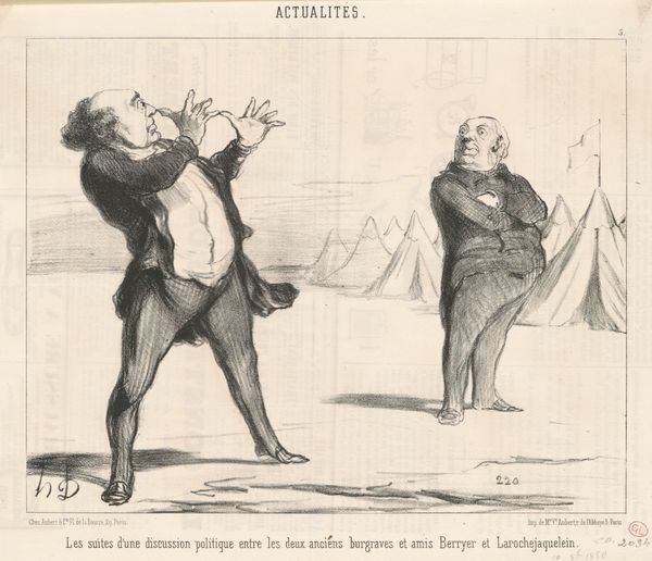 Curator: Today, we’re looking at "Dites donc, confrère, vous allez soutenir...", a lithograph crafted by Honoré Daumier in 1845, part of his "Les Gens de Justice" series. Editor: My initial reaction is one of sardonic amusement. The exaggerated features and dramatic lighting cast a decidedly critical gaze upon these figures. Curator: Absolutely. Daumier was a master of social commentary, and this print exemplifies his skill in using caricature to critique the legal profession in 19th-century France. Consider the context: censorship laws were tightening, yet satirical prints found a way to challenge the status quo through visual wit. Editor: The symbolism is striking. The heavy robes almost swallow the figures, representing, perhaps, the weight of tradition and the potential for corruption. It reminds me of theatrical masks – concealing more than revealing. There's a theatricality to their gestures that hints at performance over genuine justice. Curator: That's a perceptive point. The visual language used is reminiscent of Commedia dell'arte, making their interactions seem almost staged for public consumption, stripping bare the rituals of legal debate, casting it as a somewhat ludicrous exercise in rhetoric. We cannot forget Daumier's intent was deeply intertwined with advocating for social reform, critiquing not just individuals but the very systems in place. Editor: It makes you wonder what enduring truths are captured within this commentary; legal theatre is, alas, perhaps not restricted to 19th century France, what do you think about this statement in regards to the print's overall impact on justice and politics in later works? Curator: That it rings with universality is undeniable. It compels viewers to think about the role that performance, rhetoric, and even the potential for hypocrisy play within structures that are purportedly there for equity. It echoes far past 1845 Paris. Editor: Examining it more thoroughly makes it evident that it’s not just a comical picture but rather an intense portrayal that challenges viewers to reconsider ingrained assumptions, not unlike other contemporary satire pieces. Curator: Yes, precisely.