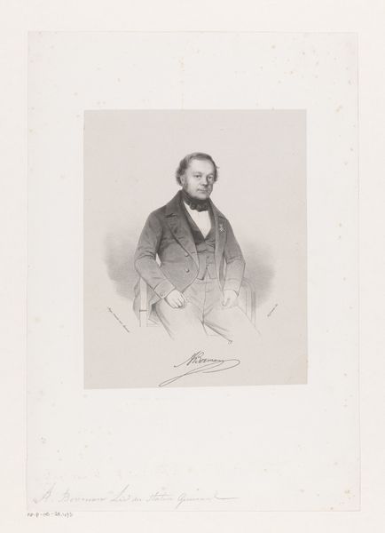 Curator: What a striking image. This is "Portret van Gerrit Lebret," a print made with graphite, dating back to 1842. It embodies elements of Romanticism, executed with clear lines. Editor: He seems almost ghostly, emerging from the paper. The lack of a fully rendered background emphasizes the subject's intense gaze and lends an air of introspection. Curator: The historical context of portraiture here is interesting. During the 19th century, printed portraits democratized access to images of important figures. Who was represented and how becomes crucial. The rising merchant classes gained a form of prestige, as printed and published artistic images like this portrait, started emerging. Editor: I see this in terms of visibility too; consider the implications of a man of status depicted with such intentionality. It prompts questions about class, gender and how such factors intersected to shape access to representation. How would he have wanted to be seen? What statements are made with his attire and his somewhat aloof expression? Curator: Those are pertinent questions to be asked. And if we think about Academic Art, the figure would be presented almost in an idealized state. Whereas the Romantic influences lend to a focus on emotionality, combined with some very tight academic training it seems. Editor: The artist's choice of medium is significant. Graphite allows for remarkable detail and subtle gradations of tone, perfect for capturing not just likeness, but also a sense of inner life. A portrait can never only just be seen as 'a good likeness'. Curator: The institution had a huge play. Printmaking houses employed talented draughtsman to record influential and known people. The public gets what the "Institution" wants it to have. A well known philosopher or social commentator maybe, what kind of role models get distributed. How widely do they get distributed... These are all essential parts of seeing the complete history, and that's always interesting. Editor: Ultimately, this portrait invites us to consider the complex interplay between art, identity, and society in the 19th century. Curator: I agree; looking at this work, there’s such value in appreciating it from different yet equally relevant perspectives.
