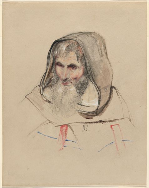 Editor: This is "Man with a Hood and Beard" by Johann Wilhelm Friedrich Kachel, made sometime between 1836 and 1873. It's a drawing done in ink, and there's something almost haunting about it, though quite simple. What’s your take on this work? Curator: The loose linework is characteristic of the 19th-century sketch tradition, and often served a pedagogical function in rapidly industrializing societies. Consider the context: rapid urbanization, changing class structures, the rise of the middle class with aspirations for cultural refinement. Editor: So it’s not just art for art's sake? Curator: Rarely! This sketch would circulate in artistic and intellectual circles, perhaps displayed in salons or reproduced in print. It speaks to the role of art in shaping public perception, but also reveals how social hierarchies influenced the artist. Note how the choice of subject—a bearded man, potentially evoking religious or historical figures—contributes to its meaning. Does that reading affect your initial reaction? Editor: I see what you mean about how social contexts influenced the reception of art like this. It is interesting to note, especially the function of sketches. What's also catching my attention is that the style and technique appear to clash; it is rough and lighthearted at the same time, which I can't wrap my head around. Curator: Think about it within a tradition of portraying "types"— the romantic rogue or religious recluse—did it carry particular meanings or social commentary during that period? Its simplicity and intimate style might have invited viewers to consider the depicted individual as more familiar or representative of their world. Editor: That helps me to understand a bit better the narrative of realism or romanticism and how these styles had an impact in art. Thanks for that insightful analysis! Curator: Likewise. Thinking about art as a historical mirror encourages deeper engagement, I think.