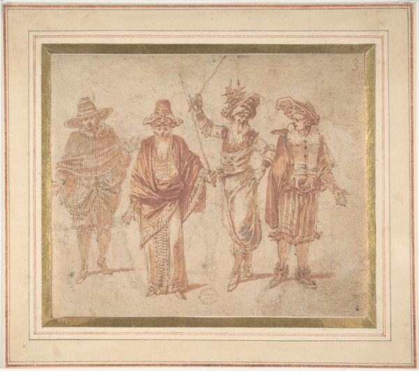 Curator: Okay, let's discuss Claude Gillot's "Figures in Theatrical Costumes," a drawing made sometime between 1685 and 1722. It's a charming peek into the world of Baroque theatre. Editor: My initial impression is lightness and airiness. The figures almost seem to float on the page, as if captured mid-gesture in a play that only they can hear. It evokes a strange quiet, though the outfits promise flamboyance. Curator: Exactly! Gillot masterfully captures that dynamism using colored pencil, along with some print work. The restrained palette really focuses your eye on the linear qualities; it directs us to follow his hand as it defined those expressive poses. The costuming is central, right? Editor: Absolutely central. The ruffs, the hats, the peculiar cuts of the garments – these define the figures as characters. Each costume dictates how a figure holds themselves, conveying character as social code. Curator: And what’s amazing is that the drawing feels both precise and spontaneous. Notice the economy of line; there's an immediacy that makes me wonder if these were studies done at rehearsals or after a performance. He captures them so well! Editor: Agreed, the gestural nature lends itself perfectly to performance! Also, how about that contrast between the meticulously rendered figures versus those looser, incomplete ones? I'm thinking about what that spatial relationship is meant to signal – an allusion to social ranking or symbolic of interior thought maybe? Curator: Fascinating. The more detailed figures project, while the sketchier ones might recede into the background. What it really reveals is that Baroque dance and theatre had this rigid structure beneath all that ornate fluff, you know? Gillot seems to highlight this paradox. Editor: You are spot on, and thanks for shining light on this understated masterwork by Claude Gillot. I’m going to be chewing on it all day! Curator: My pleasure. And, hey, maybe we'll even catch a play later!