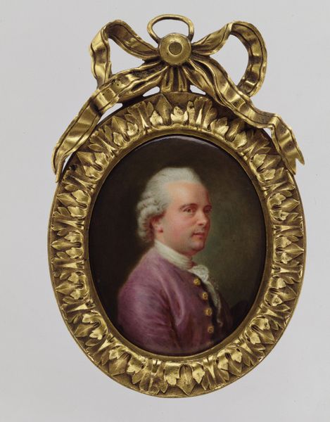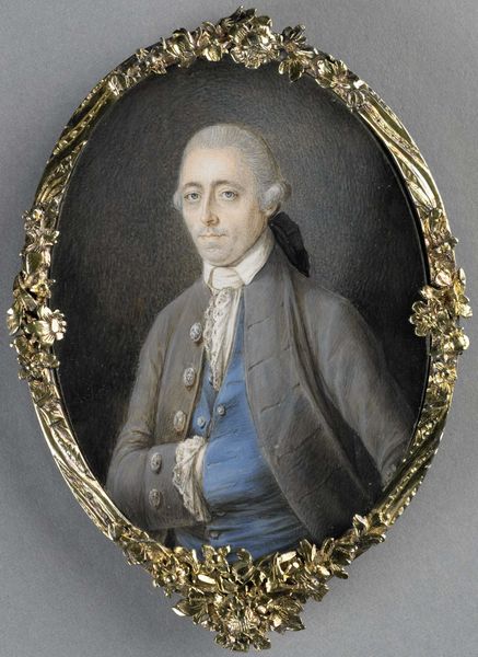 Editor: This tempera miniature, circa 1780, presents Willem V, Prince of Orange-Nassau. It's interesting how such detail is achieved on what must be a very small scale. What do you make of the composition and technique here? Curator: Indeed, the artist's control is remarkable. Note the balance achieved through the limited colour palette, primarily blues, golds, and whites, which serve to emphasize the Prince’s regal bearing. The smoothness of the face contrasts intriguingly with the texture implied in the gold embroidery. How does the circular format contribute to the overall effect? Editor: I see it adds a sense of formality, perhaps suggesting a locket or medallion, something intimate and personal, yet clearly symbolic of status. Curator: Precisely. And observe how the inscription encircling the portrait—“Honi soit qui mal y pense”—functions as both a decorative element and a signifier of authority, integrated within the frame. Do you find that the text enhances your interpretation, or does it distract from the pictorial elements? Editor: That's a great point. At first, the inscription seemed a little overwhelming, but seeing it as part of the artwork makes sense. Curator: Yes. The formal elements elevate it beyond mere representation; the artist has composed a statement about power, skillfully utilizing material and symbolic elements. Editor: Thank you. Considering the artistic choices here has broadened my perspective and improved my understanding of the Prince's representation. Curator: A close consideration of the artwork's intrinsic qualities provides insights unavailable through external analysis alone. I'm glad you found it a valuable process.