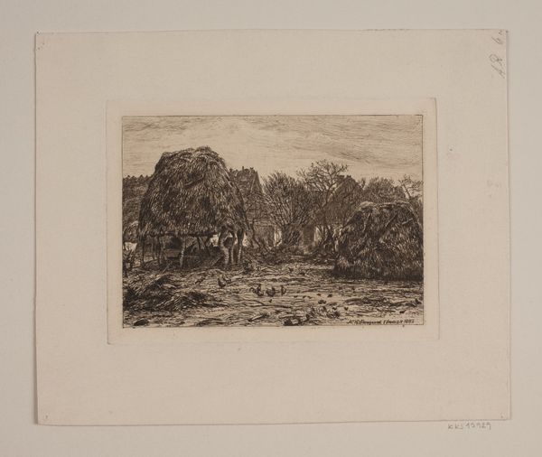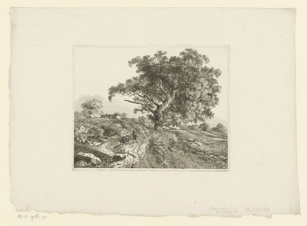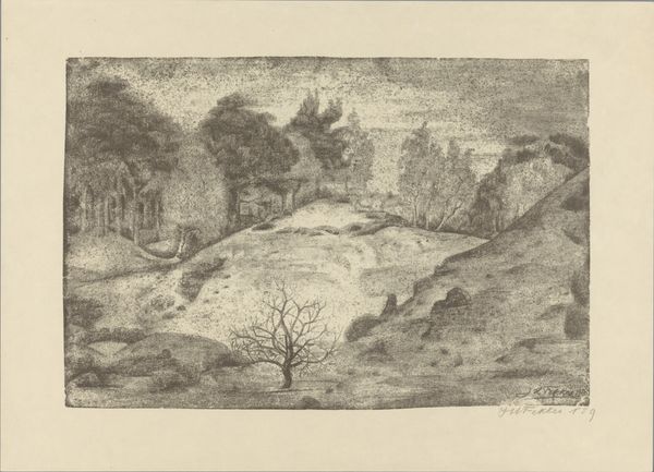 Editor: Here we have "View of Lake Nemi," an etching by Jules Laurens from 1874. The landscape, rendered in such intricate detail, has this strange, almost haunting stillness about it. What captures your attention in this work? Curator: Well, aside from the undeniable beauty, it's the sense of timelessness. This scene, frozen in ink, echoes something deep within us, doesn’t it? Like a half-remembered dream of a place both familiar and alien. Do you ever get the feeling with landscapes that they’re observing *you* as much as you're observing *them*? Editor: I do now! It’s like those trees have been standing there for centuries. The way Laurens captured their textures makes them almost seem… alive. Curator: Exactly! It's the romantic ideal, really. Look at how the dark, almost gothic, tangle of the foreground frames that distant, ethereal lake. It’s the present reaching for the sublime. Tell me, does the texture in the foreground resonate with you in a specific way? Editor: It almost feels…claustrophobic. Is that intentional, do you think? Curator: Perhaps. Or perhaps Laurens, lost in his own artistic reverie, found himself drawn to the density of life in the undergrowth. We impose narratives, don't we? Ultimately, this view reflects Jules Laurens’ interior landscape. Editor: That’s a good point, because thinking about *his* internal world rather than only thinking about Nemi itself completely transforms the meaning. Thanks! Curator: Indeed, and thank *you*! It's these unexpected moments that remind us why we love art. Isn't that marvelous?