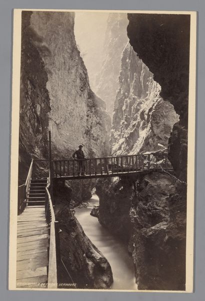 Curator: This gelatin-silver print, created in 1868, captures the Trientkloof near Martigny, Switzerland. The photographer, Ernest Eléonor Pierre Lamy, presents a rather stark, almost imposing scene. What strikes you first about it? Editor: The scale, definitely the scale. The sheer rock faces towering over those tiny figures. It speaks to a certain romantic ideal of nature’s sublime power, but with a tinge of…discomfort, maybe? Curator: It is romantic, decidedly so, fitting into the artistic and literary movement that emphasized emotion, individualism, and the grandeur of nature, after all, Switzerland became an attractive touristic landscape at that time. And yes, there's an implied power dynamic here. Look at how the photographer uses light and shadow to emphasize the verticality of the gorge, almost dwarfing the people present in the foreground. Editor: Those figures seem staged though, right? A conscious inclusion for scale, but also to legitimize this conquering gaze? Tourism’s influence made visible, like planting a flag on nature's landscape. Curator: Precisely! Their presence highlights the shift towards experiencing nature as spectacle, a view carefully curated and commodified. We should consider the print's place within the wider culture of the Swiss landscape as promoted at the time: Think of hotel advertising, guidebooks, other photographic formats available, all contributing to how and why people flocked to Switzerland, with their romantic or conquering aspirations. Editor: Absolutely. Even the tonal range – the muted sepia – evokes a sense of nostalgia, but also detachment. We are looking at a captured moment, frozen in time, making the dramatic setting both accessible and remote. It begs questions about man’s interaction with an overwhelming natural landscape in an era marked by scientific exploration and touristic curiosity. Curator: Indeed. Lamy offers us not just a representation of a geological site, but an early example of landscape photography participating in larger conversations around the cultural construction of nature. This piece becomes particularly compelling when viewed alongside other artistic mediums of that era as we’ve noted. Editor: I agree. The symbolism of these dominating rocks persists—reminders of an often intimidating world as the old one wanes. I found new perspectives and emotions with that knowledge.