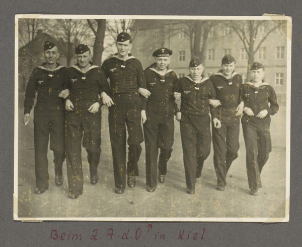 Curator: So, here we have an unsettling gelatin-silver print titled "Duitse Luftwaffe militairen aan de kust"—"German Luftwaffe soldiers on the coast"—dated sometime between 1940 and 1945. It resides here at the Rijksmuseum. Editor: Immediately, there's something about the grey tonality that washes over me… like a persistent, muted fog. It sets a strange atmosphere. I can almost smell the dampness and feel the gritty sand. Curator: The grain in the gelatin-silver is definitely a texture, isn't it? Looking closer, you start to see it's a pretty standard group portrait of German airmen posed on a beach. Given the probable time, though, it transcends being merely a photograph, no? Think about the labor involved. Every print of this type necessitated manual development, chemicals, paper. This isn’t a candid shot from a phone. Editor: True, and their uniforms speak of industry and control. Each stitch, button, precisely placed... but despite the posed formality, you almost catch a fleeting hint of individual apprehension in their eyes, especially the younger ones. Does it capture a sense of looming defeat, perhaps? A collective weariness despite the facade of military precision? Curator: It's hard to tell intentions from a face in a picture, of course. What resonates more for me is this sense of performance of power. The backdrop isn't some staged studio; it's the Dutch coast, claimed—temporarily—as a spoil of war. The very sand beneath them is a stage upon which their authority plays out, enabled and amplified through material processes of war and photographic record. It makes me think about the function and nature of wartime propaganda, especially image distribution at the time. Editor: But the tide eventually comes in, right? The ephemerality of the setting contrasted with the photograph's attempt at permanence becomes poignant. I imagine their carefully constructed image slowly eroded by the persistent power of nature—the eternal rhythm of tides indifferent to their brief occupation. Curator: The materiality is so striking. Even a photographic print has a tangible lifespan—a limited exposure to light, chemical reactions at play. I see this photo existing now as a relic, evidence, and a question of what and how it communicates beyond any intention. Editor: It does feel imbued with layers. As a simple snapshot it holds power, and those textures become emotional. It speaks of human imposition and a battle against time itself. Food for thought indeed.