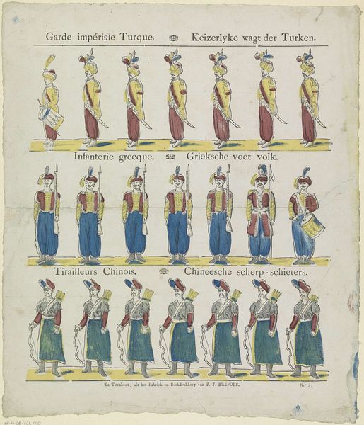 Philippus Jacobus Brepols created this print called "Togt der infanterie / Infanterie en marche" whose date is unknown with etching. Notice how the figures are organized into neat rows and columns. This creates a sense of order and uniformity, typical of military formations. The use of color is strategic, with each row distinguished by a different color scheme—reds, yellows, and blues. This may not only represent different units but also serve a structural purpose, guiding the viewer's eye across the composition. Brepols uses line to delineate the uniforms and weaponry, providing a precise depiction of each soldier's attire and equipment. The lack of depth flattens the image, turning it into a pattern rather than a realistic scene. This flatness emphasizes the print's surface and its nature as a constructed representation. The rigid arrangement suggests a semiotic system, where each element—uniform, weapon, color—functions as a sign. It is open to ongoing interpretation, inviting us to reflect on the interplay between representation and reality.