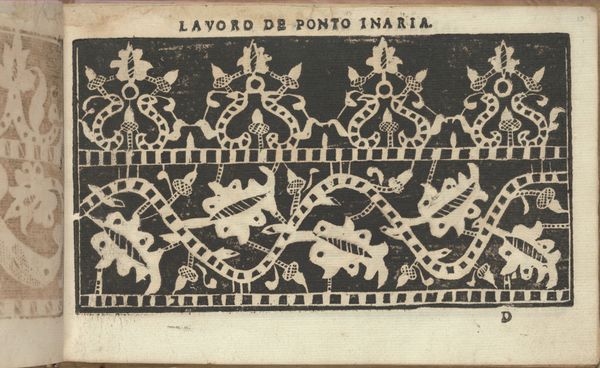 Editor: Here we have a page from "Studio delle virtuose Dame," created in 1597 by Isabella Catanea Parasole. It's a print, using engraving or woodcut, showcasing patterns. The stark contrast between black and white really makes the design pop! I'm curious – what strikes you most about this particular page? Curator: It whisks me back to a time of intense creative ferment, doesn't it? Imagining Parasole meticulously crafting these patterns… each line etched with purpose. Look at how she marries rigid geometric forms with organic, flowing motifs. There's a delicious tension, wouldn't you agree? Almost a visual conversation about control versus freedom, order versus chaos. Tell me, does that push and pull resonate with you? Editor: Absolutely! It feels so intentional. And to think, these weren't just abstract designs – they were intended as templates, right? Practical art! Curator: Precisely! A dance between high art and domestic craft. These pattern books were incredibly important in disseminating fashionable designs, empowering women to participate in the economy through needlework and lacemaking. The artistry's undeniable, but the book's intention goes further, providing a means to access art and creativity to all. And for an artist like Parasole to get it out there, now that's exciting! It's something to meditate upon... Editor: So, it's beautiful *and* functional, *and* potentially revolutionary! Curator: Quite! It's like stumbling upon a secret code from the Renaissance. Keeps me wide-eyed, at any rate! Editor: I never thought I'd say this about a pattern, but I'm strangely moved. Thanks for unlocking a whole new layer of understanding!