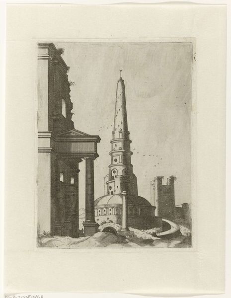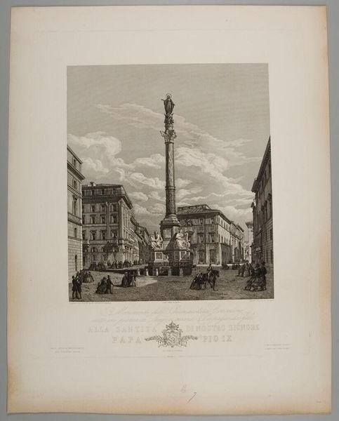 Curator: Here we have Domenico Amici’s “Lateran Obelisk at St. John Lateran.” Editor: It’s immediately striking how the obelisk utterly dominates the composition, a vertical thrust that dwarfs everything around it. Curator: Indeed. The obelisk itself is an ancient Egyptian symbol, repurposed by the Romans and then, in this context, by the Catholic Church. It represents a fascinating lineage of power and belief systems. Editor: And Amici’s rendering emphasizes its materiality. Look at the texture of the stone, the way light plays across its surface. The cross at its apex transforms it into a Christian symbol, overlaid upon pagan origins. Curator: Exactly. It speaks to the layering of cultural meaning, how symbols evolve and are adopted, transformed, to fit new narratives. Editor: But even within the frame, there's a tension. The grandeur of the obelisk contrasted with the almost mundane activity in the foreground – the carriages, the figures. Curator: A reminder that even monumental symbols exist within a lived, human context. It invites us to consider the enduring power of symbols to shape our perceptions of space and history. Editor: Yes, its visual presence and Amici’s careful rendering offer a deep dive into visual history.