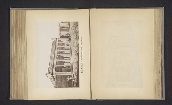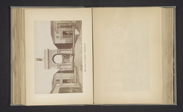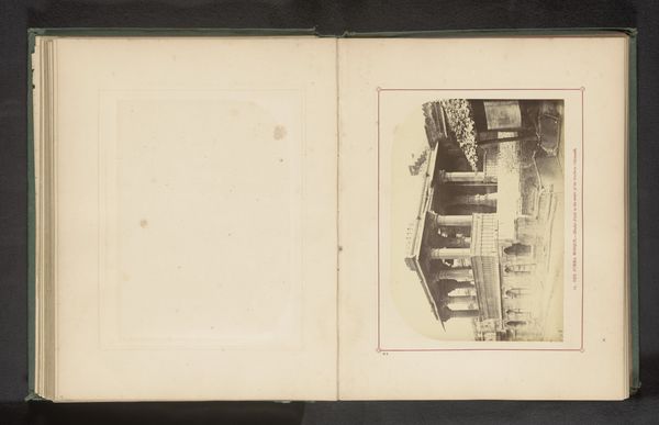 Curator: Oh, this is quite remarkable, isn't it? We're looking at an early photographic print, predating 1895. It’s called “Fotoreproductie van een gezicht op de tempel van Venus," showing the Temple of Venus in, well, somewhere I don't immediately know... the scan is showing it in the pages of an open book, maybe we could infer from there? Editor: My first thought is how very…sepia it is. It immediately brings to mind old family albums and long-lost vacations. It almost feels dreamlike, removed from our time. So, Venus and dreamlike qualities: romance and desire... It's interesting. Curator: It’s striking how solid those forms feel, how crisply rendered—architecture through a romanticizing lense. Editor: Precisely. The print is imbued with such stillness, yet it depicts a site laden with histories and conquests. How do we reconcile those clashing narratives, the placid image with its very violent, active past? Curator: The architecture is inherently coded. The columns, that almost brutally perfect symmetry... it’s intended to inspire awe, an embodiment of Roman power made, in some ways, disturbingly real through photography. But it also offers something deeply vulnerable, if you can perceive its long slow state of decay, as its surfaces begin their retreat towards oblivion. Editor: Decay also echoes lost love or perhaps how Venus's temples weren't just dedicated to love as romance but to pleasure, to a powerful and political force. Thinking of Venus as a deity of power subverts the expectation to find only gentle romantic ideas here. It's almost rebellious. What do you feel is missing in this image, for you? Curator: Movement! There are no figures, no sense of the city teeming around it. This feels…preserved. A moment out of time, yes, like memory does—and, to some extent, art should do, too. It is not real space and time in the image but something deeply emotional and intensely fragile. It whispers of mortality. I wonder, too, about the photographer, peering through that lens a lifetime ago… Editor: Agreed, a trace of absence that amplifies the politics, time, and memory intertwined within it. What remains is the story, inviting us to unpack how the aesthetic choices—photography and preservation—create very pointed meanings about cultural value and power. That tension gives it a unique potency. Curator: A little death mask, perhaps? Lovely thought. I see its light differently now! Editor: Absolutely, as it unveils another facet. Let’s pause on that—an early photographic moment, caught mid-reflection!