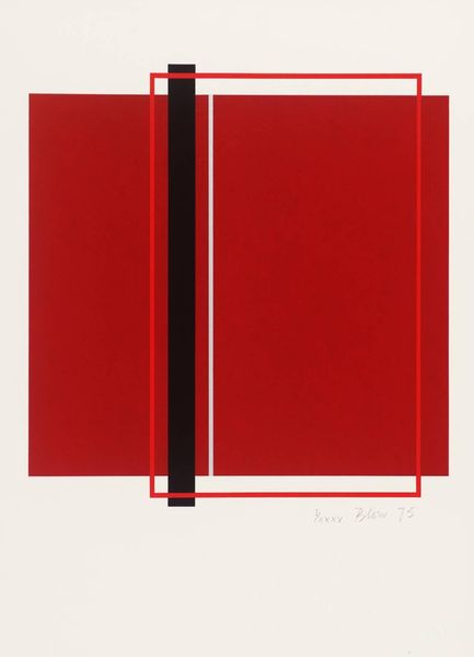 Curator: This is "Canto XVIII", a print created by Barnett Newman in 1964. Editor: Well, it's stark, isn't it? That limited palette and those simple rectangular forms command attention. It's also immediately somber, and heavy with a feeling of austere reduction. Curator: Indeed. The choice of printing, a medium often associated with reproduction and distribution, is interesting. How does Newman elevate what could be considered a more democratic process to the realm of high art? We must examine the tension between his artistic choices and the medium’s inherent properties. Editor: Absolutely. The print, with its repetitive geometric shapes, can be seen as a critique of standardization within cultural production. Consider also the historical context; Abstract Expressionism was gaining traction in an era characterized by widespread social change. What public statements might Newman have been making through this bold but reduced piece? Curator: Precisely. We also must not ignore the tactile presence of the work, the textures created by the printmaking process itself. Each individual impression becomes significant, imbued with the hand of the artist despite the industrial undertones of printmaking. This haptic engagement underscores a crucial materiality, resisting pure conceptualization. Editor: I agree. The format also challenges conventions of exhibition. Consider, what statement might the museum be making, by including this specific work into the grander art historical narrative? Does it endorse, question, or simply contextualize prevailing social values? Curator: Good question, the location and modes of display fundamentally shift its public value, and invite speculation as to Newman's broader commentary on power. Editor: In short, it seems both the form and socio-historical positioning are inseparable. Curator: Absolutely. The artistic and cultural values create rich engagement that goes beyond face value.