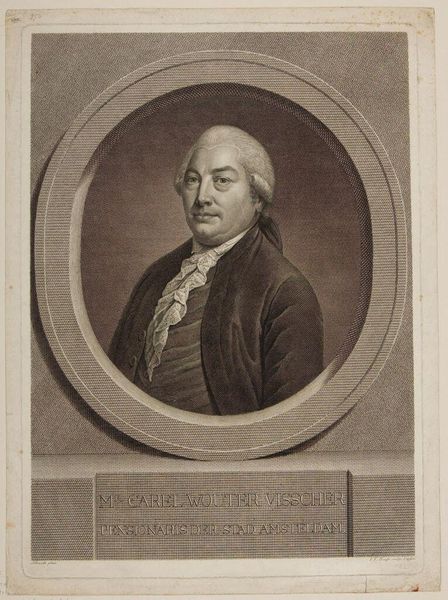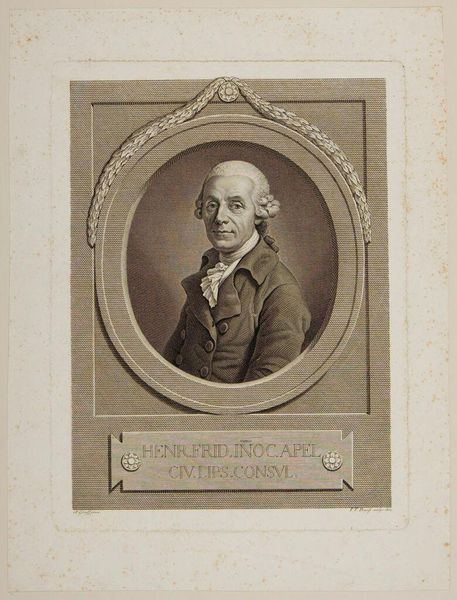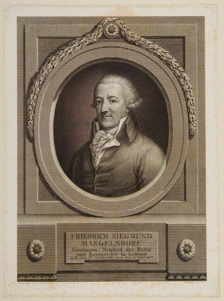 Curator: This print depicts Christian, Freiherr von Münch, rendered by Johann Friedrich Bause. I see the sitter encircled in an oval frame atop a plinth bearing inscriptions. Editor: It strikes me as quite formal, even a bit austere. The gray scale reinforces that sense of controlled presentation. Curator: Indeed. The symbolic weight here stems from the deliberate composition. The oval, a classical symbol of eternity, and the inscription showcasing titles, speak to lineage and legacy. Editor: And perhaps reinforces a sense of class hierarchy? The subject's gaze is direct, but there’s a guarded quality, reflective of the power dynamics of that era. I'm curious about Bause’s choices in portraying Münch within those social constraints. Curator: Consider the heraldic shield, too—a potent symbol of identity and affiliation. Bause skillfully employs it to anchor Münch within a specific cultural and political context. Editor: Absolutely. It makes you consider who had access to portraiture and how it functioned to preserve particular narratives of power. Curator: Pondering the layers of representation enriches our understanding of not just the sitter but the society that produced him. Editor: Yes, and how these historical representations continue to shape our perceptions today.