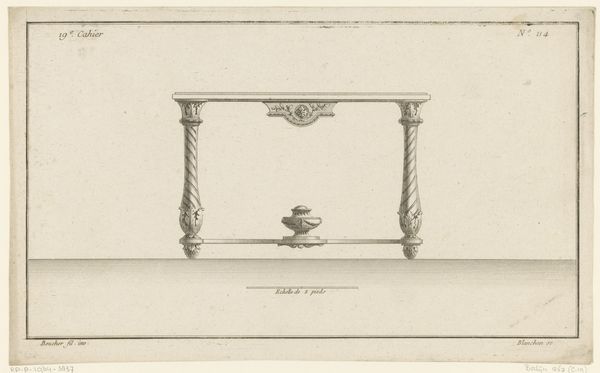 This finely detailed drawing was made by Jean Guillaume Blanchon in the 18th century. It depicts a design for an elaborate table, likely intended as a presentation piece for a skilled cabinetmaker. The drawing meticulously captures the intricate details, such as the lion's head and garlands, giving us a sense of the design’s intended opulence. What is most striking is the way the material of the intended table influences its appearance: the weightiness of carved wood, the smooth polish of the tabletop. The design implies specific techniques, and the skilled traditions associated with woodworking. The drawing highlights the social context of luxury goods in the 18th century, reflecting the tastes of wealthy patrons, and the labour involved in producing such refined furniture. By focusing on the craftsmanship and context of its production, we can appreciate the artistry involved.