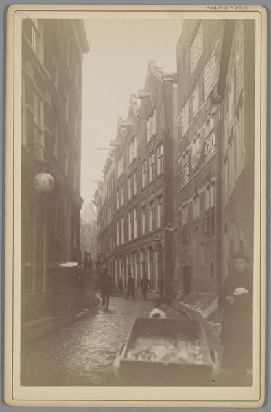 Curator: This gelatin-silver print, "Boompjes in Rotterdam," was created by Pieter Oosterhuis sometime between 1859 and 1865. It's currently held at the Rijksmuseum. What's your initial take? Editor: Stark and strangely calming. The long, diminishing perspective is very compelling. There’s a muted quality to the light. It feels very much of a bygone era. Curator: Precisely! The formal structure relies heavily on that one-point perspective. Look at how the receding lines of the street and buildings converge. Oosterhuis masterfully uses depth to create a sense of vastness within the urban landscape. Editor: And the street itself, paved in cobblestones, leads us to an implied narrative, doesn’t it? Cityscapes often become metaphors. The distant buildings almost vanish in the haze. Rotterdam was—and is—a crucial port. Symbolically, this evokes themes of transition, trade, and the ephemeral nature of urban life. Curator: Absolutely. Notice how the tonal range, while subtle, creates distinct layers. The darker trees on the left frame the lighter buildings, providing a visual anchor and contrast. The formal tension balances detail and atmospheric perspective. Editor: These grand buildings represent stability, yet are softened by those almost dreamlike trees. A juxtaposition, perhaps, mirroring society itself. The "Boompjes" likely served as a promenade. Curator: Indeed. Also consider the historical context. Photography at this time was becoming increasingly accessible, shaping how people perceived their environment. Oosterhuis was among the pioneering figures in this evolution. Editor: He immortalized more than buildings; this photograph transmits feelings, really. That hushed feeling you have at dawn or dusk when contemplating the steady presence of history around us. It almost has a painterly quality. Curator: Precisely! Oosterhuis harnessed photography’s technical possibilities to capture that precise effect. The lines are very strong throughout. Editor: Ultimately, "Boompjes in Rotterdam" is an understated yet impactful slice of 19th-century urban consciousness rendered timeless through Oosterhuis's lens. Curator: I agree. It provides us with a powerful record of time, skillfully preserved and precisely composed through careful compositional structuring.