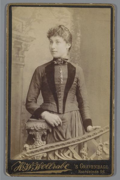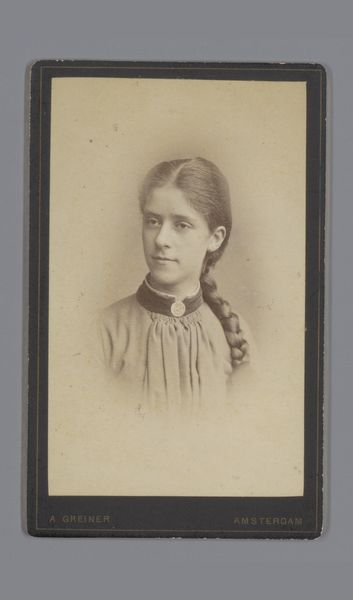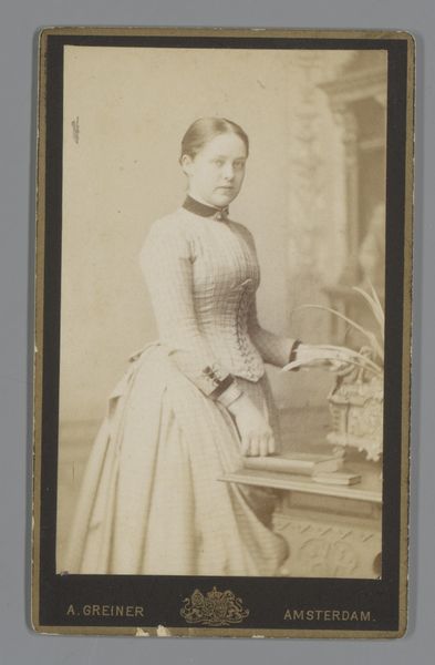Editor: This is "Portret van Anne Gesiena Jonker" by Albert Greiner, made between 1870 and 1887. It's an albumen print photograph. There's something serene, almost wistful, about her gaze. What do you see in this piece beyond just a historical portrait? Curator: I see a carefully constructed image that speaks volumes about gender roles and the performance of identity in the late 19th century. Consider her pose—refined, demure—and the books upon which she rests her hand. This is not merely a portrait; it is a deliberate statement about Anne Gesiena Jonker’s perceived status, intellect, and societal value. How does the backdrop inform this understanding for you? Editor: I hadn't thought of that! The blurry background almost seems to fade her into a space that's neither here nor there. Like she is there and isn't there. Curator: Exactly! This ambiguity is key. Photography in this era was rapidly evolving, becoming more accessible, yet portraiture, especially for women, remained carefully controlled. The soft focus romanticizes her, but it also subtly reinforces the idea of woman as an idealized, almost ethereal figure, a theme prevalent in both art and literature of the time. Where do you see challenges to her societal position? Editor: I guess the very fact that we have this image means her family must have had some degree of social standing and/or wealth... I wonder to what extend she even had control over her representation... Curator: Precisely. It compels us to consider whose gaze is being prioritized: Anne’s, the photographer’s, or that of the presumed male viewer? Considering whose perspectives are validated then and perhaps even now... Editor: It’s fascinating how much is packed into one seemingly simple photograph. Curator: Indeed! And it reminds us that even what we perceive as “realism” is always mediated by cultural context, power dynamics, and artistic intention. Editor: I'll never look at an old portrait the same way again. Thanks!
