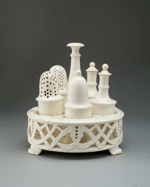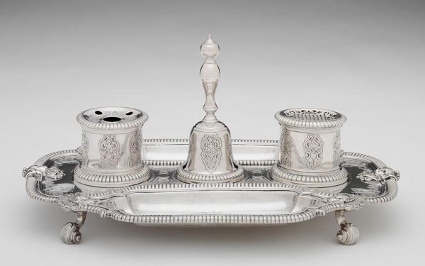 Editor: Here we have Isaac Ribouleau's "Cruet Stand, Casters, and Bottles," of unknown date. It's quite striking, the silver against the clear glass. What do you see in this piece, focusing on its form and composition? Curator: I am drawn to the interplay of geometric forms: the smooth curves of the bottles juxtaposed with the sharp angles of the silver casters. Consider how the reflective surfaces of the silver amplify light, creating a dynamic visual experience. Editor: The repetition of shapes is also interesting, isn't it? Curator: Indeed. The artist uses repetition to create a sense of rhythm and harmony, a testament to the craftsmanship and formal qualities inherent in the work itself. The strategic placement of each element contributes to an overall sense of balance, wouldn't you agree? Editor: That's a great point! Thanks for helping me see it in a new light.