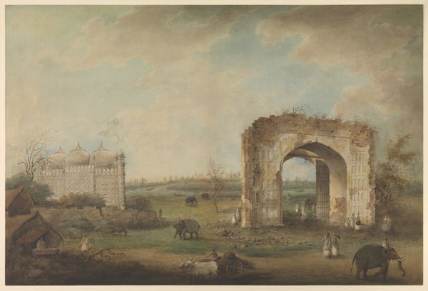 Editor: So, this piece is called "Ein Hirte treibt sieben Schafe durch ein Stadttor," which I believe translates to "A Shepherd Drives Seven Sheep Through a City Gate." It’s attributed to Regnu and appears to be a watercolor and ink drawing on paper. It's charming. What really grabs my attention is the way the light defines the textures of the brick and stone alongside these little moments of daily life playing out. What do you see in this work? Curator: I see a material record of urban life and its dependence on rural economies. The imposing city gate, rendered in meticulous detail, speaks to the power structures and trade networks of the time. But let's look closer at how the sheep, and the shepherd's labor, are being integrated into that context. These animals represent commodities and subsistence. Notice also the market scene—what goods do you think they're selling? Editor: Maybe grain? Or some other agricultural product. I guess the whole image underscores the relationship between the city and the countryside. Curator: Exactly. And consider the labor involved in creating the artwork itself. The process of making paper, the sourcing of pigments, the artisan skills required for precise drawing. These were all forms of work that shaped artistic production and reflect larger economic forces. What kind of consumption is being suggested, besides literal foodstuff? Editor: You mean like... artistic patronage? Curator: Precisely. This piece reminds us that even scenes of seemingly simple pastoral life are embedded within complex networks of materials, labor, and capital. So it's less about the sentimental mood and more about the real economic engines operating behind it. Editor: That’s really fascinating. I'll definitely look at art differently now, thinking about its creation as a kind of labor itself.