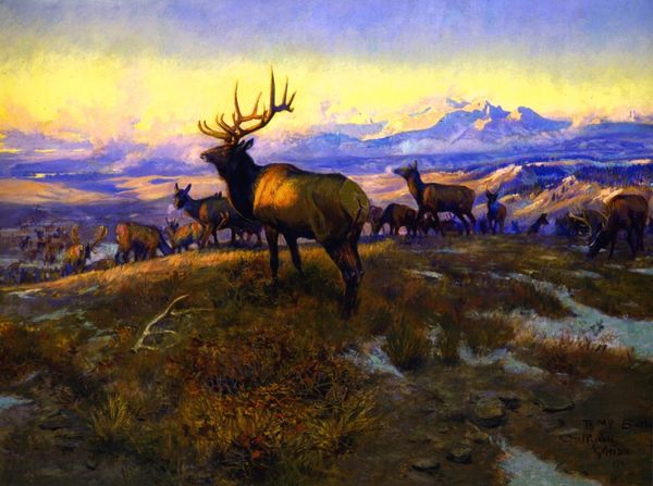 Rosa Bonheur made this drawing, "The Call of the Stag," with pastels on paper. Pastels, made from ground pigments, give the image a soft, almost dreamlike quality. Bonheur's choice of pastels is significant. It’s a material far removed from the grand, academic painting of her time. Traditionally, pastels were often used for preparatory sketches, not for finished works worthy of exhibition. Bonheur elevates this medium, demonstrating her mastery and challenging the hierarchy of artistic materials. Look at the texture she creates: the feathery clouds, the rough grasses, and the stag's velvety coat. The dry, powdery nature of pastels allows for subtle gradations of tone and color, capturing the atmosphere of the scene. Bonheur’s embrace of this humble material reflects a shift towards a more direct, and personal form of expression. By emphasizing the material and the artist's hand, we can appreciate the skill and artistry involved in creating this evocative scene, challenging traditional distinctions between craft and fine art.