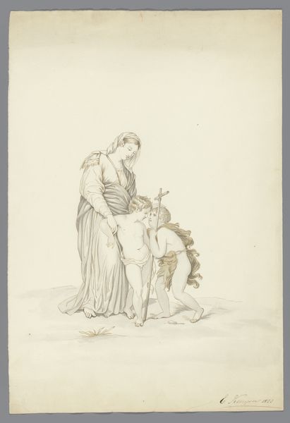 Christina Chalon created this small drawing, "First Steps of a Child," using pen and brown ink, capturing a tender moment between a mother and child. Born in the mid-18th century, Chalon navigated a world where women artists often faced limited opportunities, yet she achieved recognition through her talent and dedication. This piece reflects the cultural emphasis on motherhood and domesticity during that era, but it also offers a glimpse into the personal connection between caregiver and child. The delicate lines convey an emotional resonance, evoking the universal experience of nurturing and guiding a young one. The artwork subtly challenges traditional representations by focusing on the intimate, everyday aspects of family life, and the quiet strength of women within the domestic sphere. Through this small window into the past, we are reminded of the enduring bonds of love and care that transcend time and circumstance, and how art can capture and celebrate these fundamental aspects of the human experience.